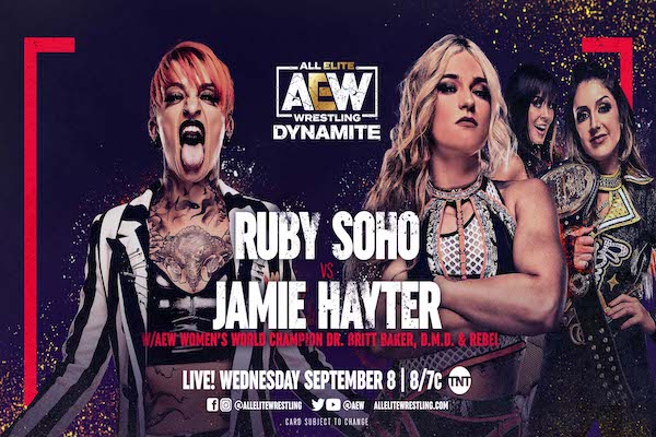 After making her surprise debut at All Out on Sunday as the joker entry in women’s Casino Battle Royal, Ruby Soho will wrestle on Dynamite for the first time against Jamie Hayter.