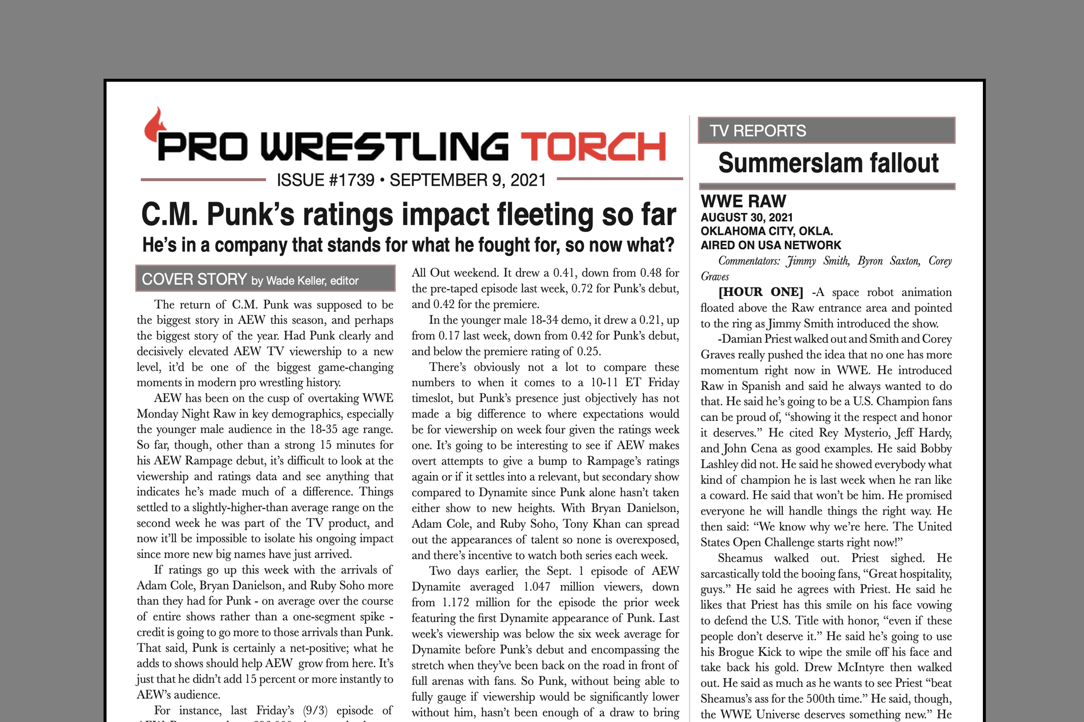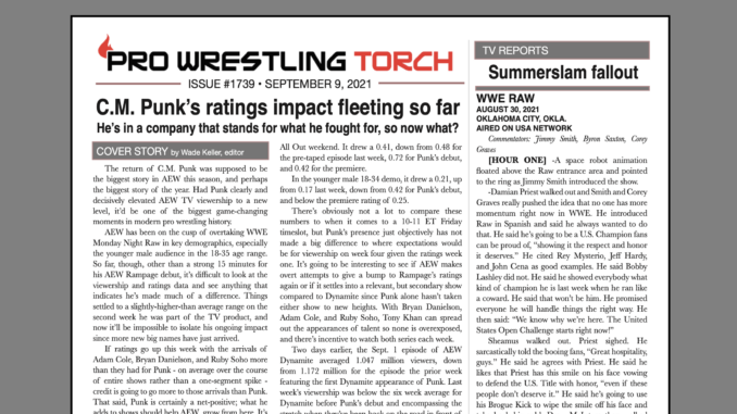 SUMMARY: This week’s PWTorch Newsletter features Wade Keller’s cover story on early returns on C.M. Punk’s AEW impact… Feature column by Greg Parks looking at the lay of the land for WWE championship matches… Torch Newswire… Keller’s TV reports on WWE Smackdown, WWE Raw, AEW Dynamite… And more..