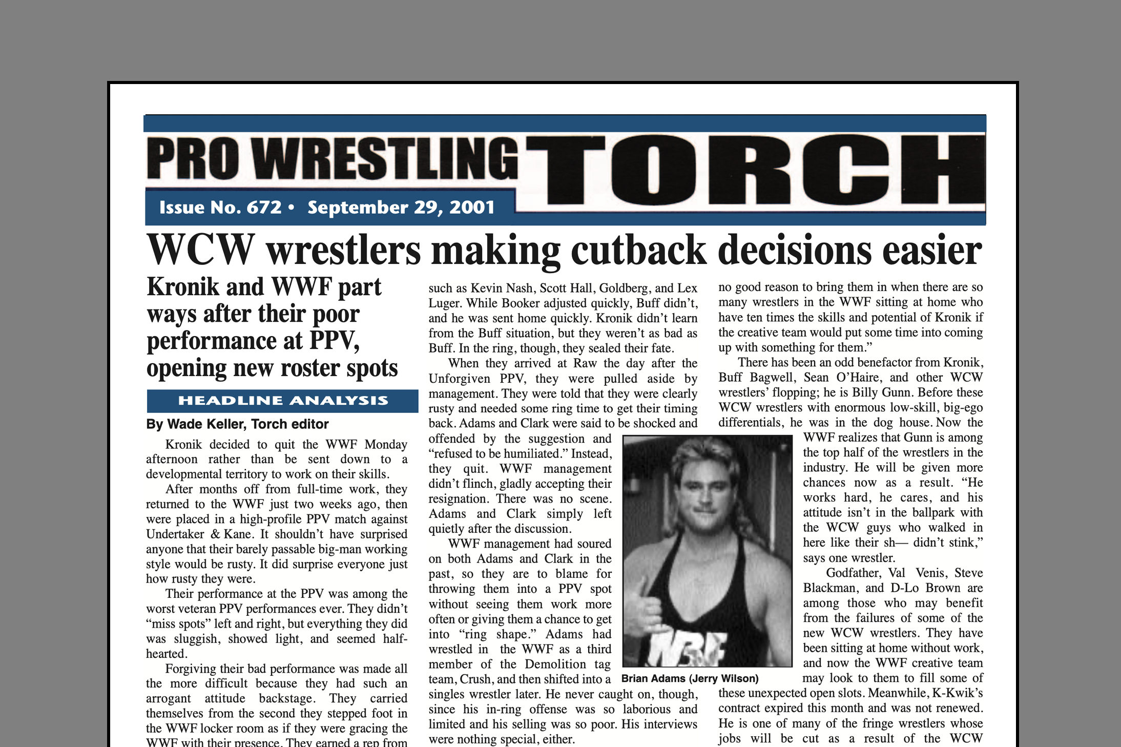 SUMMARY of #672 cover-dated September 29, 2001: This issue includes a cover story on the major problems WCW wrestlers were having adjusting to the WWF… In-depth coverage of the WWF Unforgiven PPV including Austin vs. Angle and Rock vs. Booker T & Shane McMahon… Part four of the Torch Talk with Terry Taylor where he breaks down his impression of why WCW failed and compares working with the top stars of both promotions… Plus 1991 Backtrack where Jesse Ventura compares Vince McMahon’s approach to slavery, reports on Raw and Smackdown, ETC. Newswire, a WWF live event report, and a review of Tough Enough’s first season…
