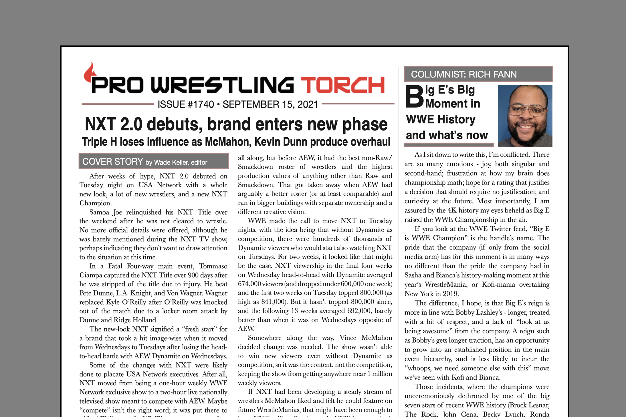 SUMMARY: This week’s PWTorch Newsletter features Wade Keller’s cover story on NXT 2.0… Rich Fann’s feature column on Big E’s historic WWE Title win… Greg Parks’s feature column looks at possible AEW to WWE jumps… Keller’s TV reports on WWE Smackdown, AEW Rampage, WWE Raw, and NXT 2.0… Torch Newswire… More…