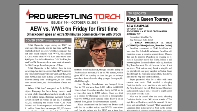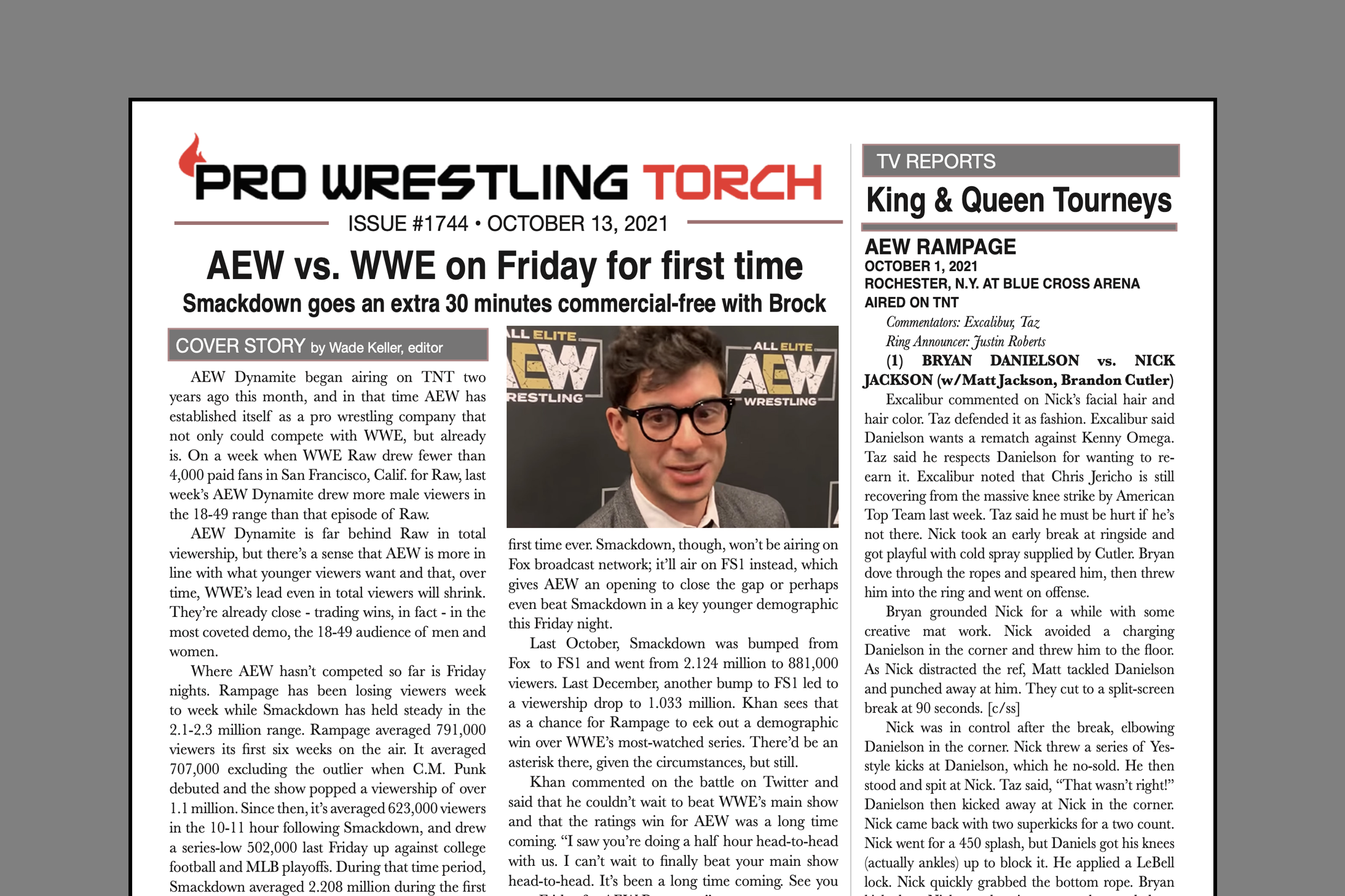 SUMMARY: This week’s PWTorch Newsletter features Wade Keller’s cover story on the Friday night battle between AEW Rampage and WWE Smackdown, and why Tony Khan isn’t crazy to be predicting victory… Alan Counihan’s column on the rise of Pro Wrestling Noah, an emerging new stars, and why New Japan could have formidable competition on the rise… Greg Parks column evaluating this year’s WWE Draft… Keller’s TV reports on AEW Dynamite, AEW Rampage, WWE Raw, and WWE Smackdown… Torch Newswire… And more…