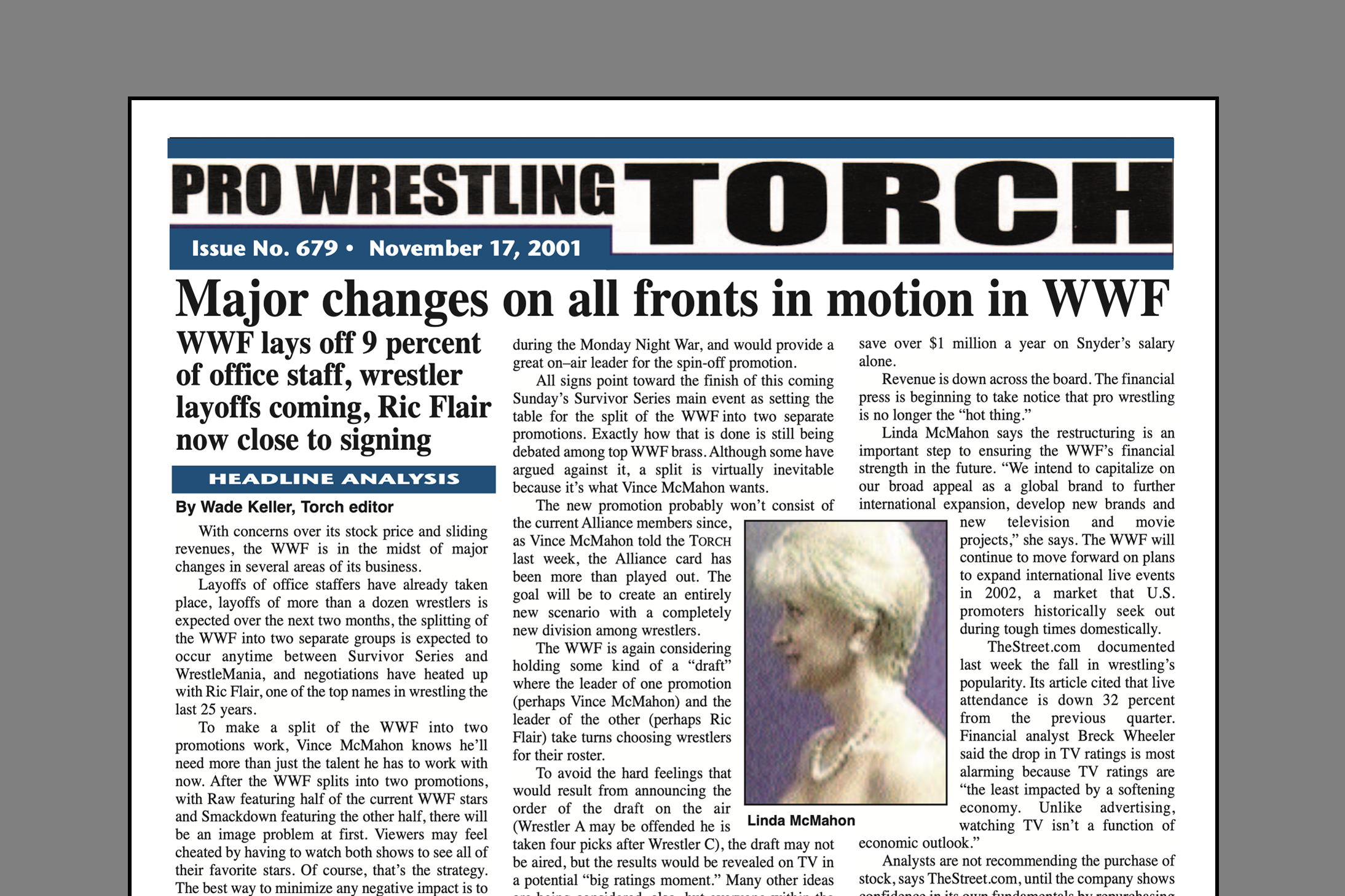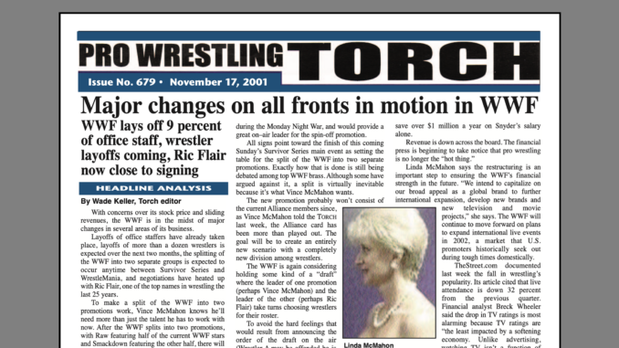 SUMMARY of #679 cover-dated November 17, 2001: This issue begins with a cover story on major changes on all fronts in the WWF… WWF Newswire details Eddie Guerrero’s DUI and Karen Angle ripping on Rob Van Dam, plus behind the scenes news… ETC. Newswire features Bret Hart interview highlights… Torch Talk with Jim Ross, pt. 2, features his take on the demise of WCW… Plus a feature column by Wade Keller on the upstart XWF, Keller’s End Notes on the WWF on Weakest Link, Letters to the Torch praising Jim Ross, Terry Taylor, and Pat McNeill, reports on Raw and Smackdown, a WWF Live Event Report, and two 1991 Backtracks…