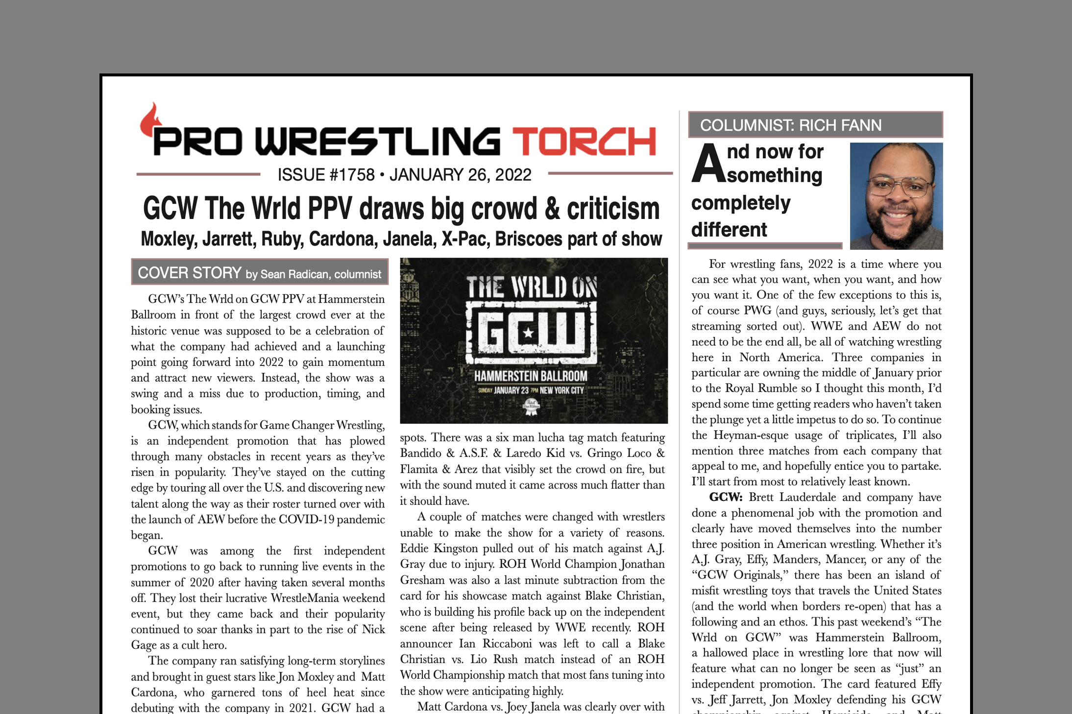 SUMMARY: This week’s PWTorch Newsletter features Sean Radican’s cover story on GCW The Wrld PPV featuring Nick Gage, The Briscoes, Jon Moxley, Jeff Jarrett, X-Pac, Ruby Soho, Matt Carndona, and more… Greg Parks column asking rhetorical questions about NXT 2.0… Rich Fann column on GCW, Enjoy Wrestling, and Terminus… Torch Newswire… Keller TV reports on Raw, Smackdown, and Dynamite…