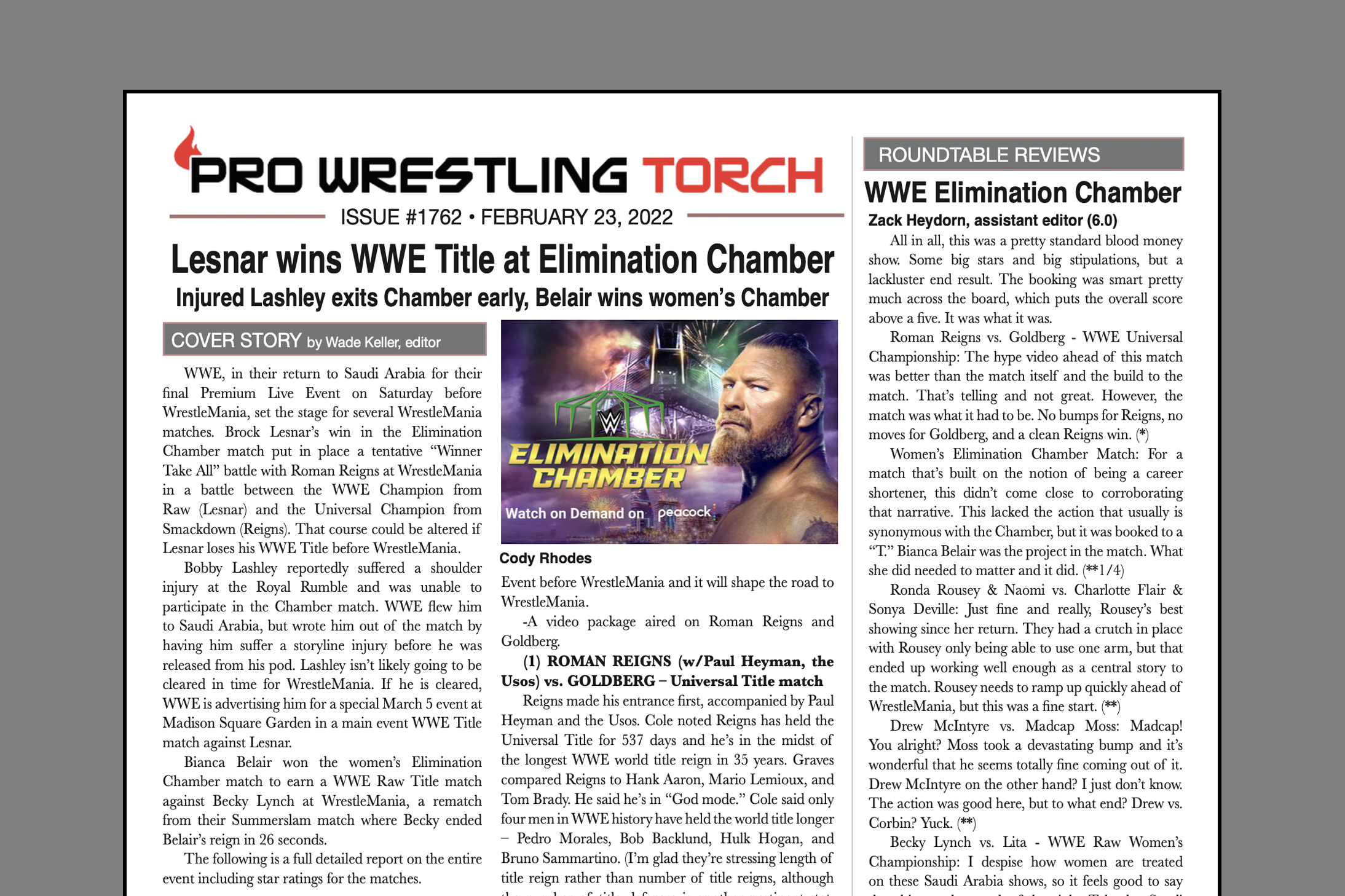 SUMMARY: This week’s PWTorch Newsletter features Wade Keller’s WWE Elimination Chamber report and Staff Roundtable Reviews… Greg Parks looks at Cody Rhodes’s possible roles in WWE… Keller’s TV reports on Smackdown, Raw, and Dynamite… Torch Newswire… More…