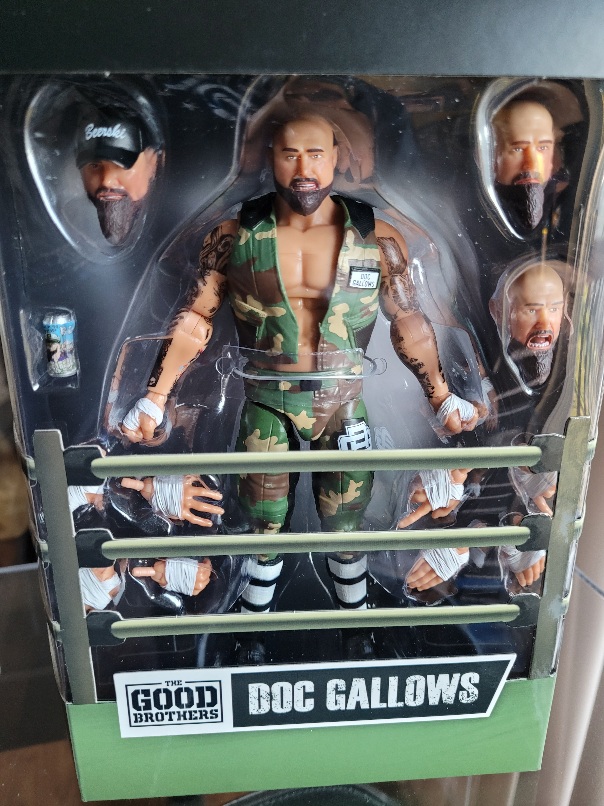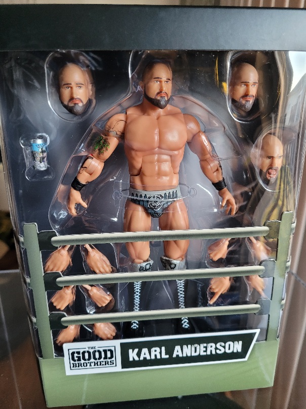 Much like the Myers and Cardona figures, the Good Brothers figures are highly detailed and are loaded with accessories. Doc Gallows wears a camouflage vest and pants. Multiple hands are included, along with four different heads (different expressions and one is wearing a baseball hat). Karl Anderson has grey tights and knee pads, along with black boots. His figure includes multiple hands and four heads as well. Both figures also include a beer can. If I have a complaint, it’s the faces for Doc Gallows. Super 7 always seems to be a bit off with the faces and this set is no exception. The Gallows faces kind of look like Anderson to me.