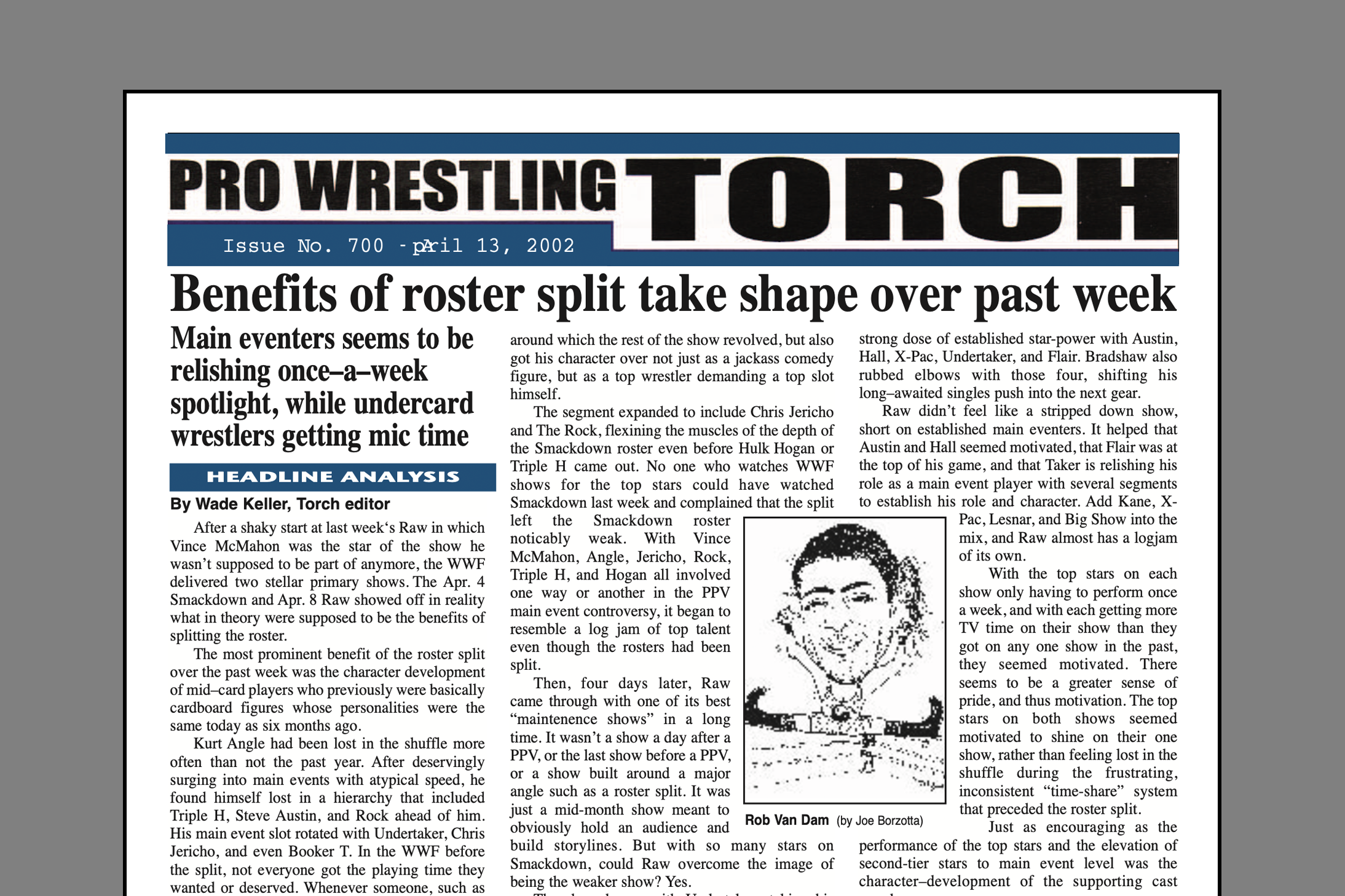 VIP 2002 BACK ISSUE – Pro Wrestling Torch #700 (April 13, 2002): Benefits of roster split apparent after one week, Mitchell’s Book Reviews, Jimmy Hart Torch Talk begins, Keller’s King of Ring forecast