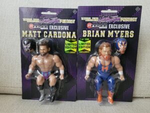The other set that is inspired by the old AWA figures is the latest release from the Major Wrestling Figure Podcast. This Ringside Collectibles exclusive line features Matt Cardona, Brian Myers, Mark Sterling, and a referee. I received the figures of Cardona and Myers last week and they are pretty awesome. Each of their figures comes with an alternate masked head. The figures go for $26.99 at ringsidecollectibles.com.