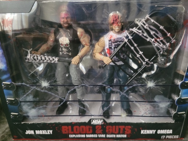 The latest edition of Jazwares’ AEW Blood & Guts series has arrived! This set recreates the infamous Exploding Barbed Wire Death Match between Jon Moxley and Kenny Omega from last year’s AEW Revolution show. This box set includes figures of Moxley and Omega in gear similar to what they wore during the match (both figures have blood painted on), cloth shirts, two tables, barbed wire, an AEW World Title belt, extra hands, a barbed wire baseball bat, a barbed wire chair, and a Revolution backdrop. There are instructions on the bottom of the box to direct you how to put the barbed wire on the tables.