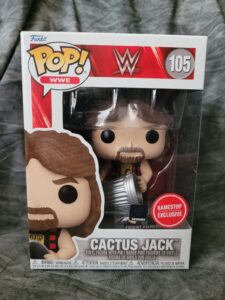 The first ever Cactus Jack Funko Pop figure is now available. The figure is decked out in his Wanted Dead or Alive t-shirt and a red & black flannel shirt. Cactus is also holding a garbage can. It’s a Game Stop exclusive (in stores and online) and costs $14.99.