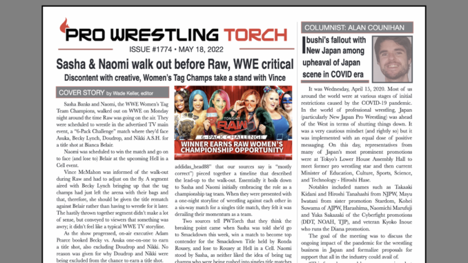 SUMMARY: This week’s PWTorch Newsletter features Wade Keller’s Cover Story on Sasha & Naomi walk-out during Raw… Torch Newswire features details on the MJF-AEW tension… Alan Counihan’s feature column on Ibushi-NJPW controversy and overall upheavel of Japan scene during COVID… Greg Parks’s feature column on NXT 2.0 prospects… Keller’s TV reports on Raw, Smackdown, Dynamite… More…