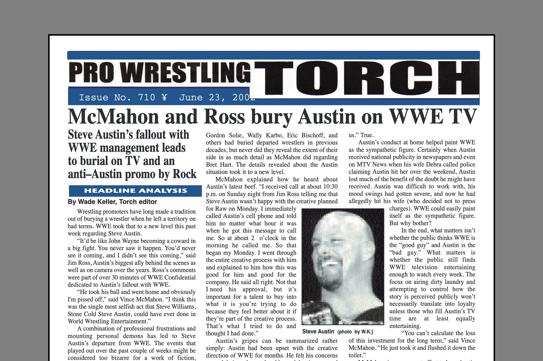 SUMMARY of #710 cover-dated June 23, 2002: This issue begins with a cover story on the WWF burying Steve Austin on television including harsh words from good friend Jim Ross… In-depth coverage of the first TNA PPV event with Keller’s report with star ratings, Roundtable Reviews, and Reader Reax… In part six of the Jerry Jarrett “Torch Talk,” he discusses whether there is an alternate business plan for TNA, whether TNA was created more as a vehicle for his son than anything, and more… Plus Torch Newswire, Ringside Beat, TV reviews of Smackdown, Raw, Heat, Velocity, and ECW, End Notes, and more…