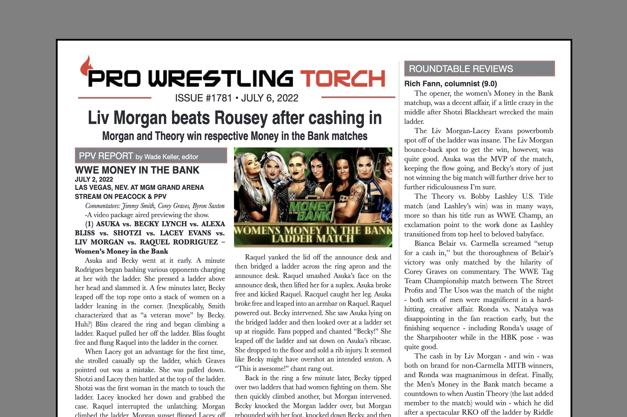 SUMMARY: This week’s PWTorch Newsletter features Wade Keller’s WWE Money in the Bank Report plus Staff Roundtable Reviews & Scores… Keller’s TV reports… NXT Great American Bash report… Newswire… More…