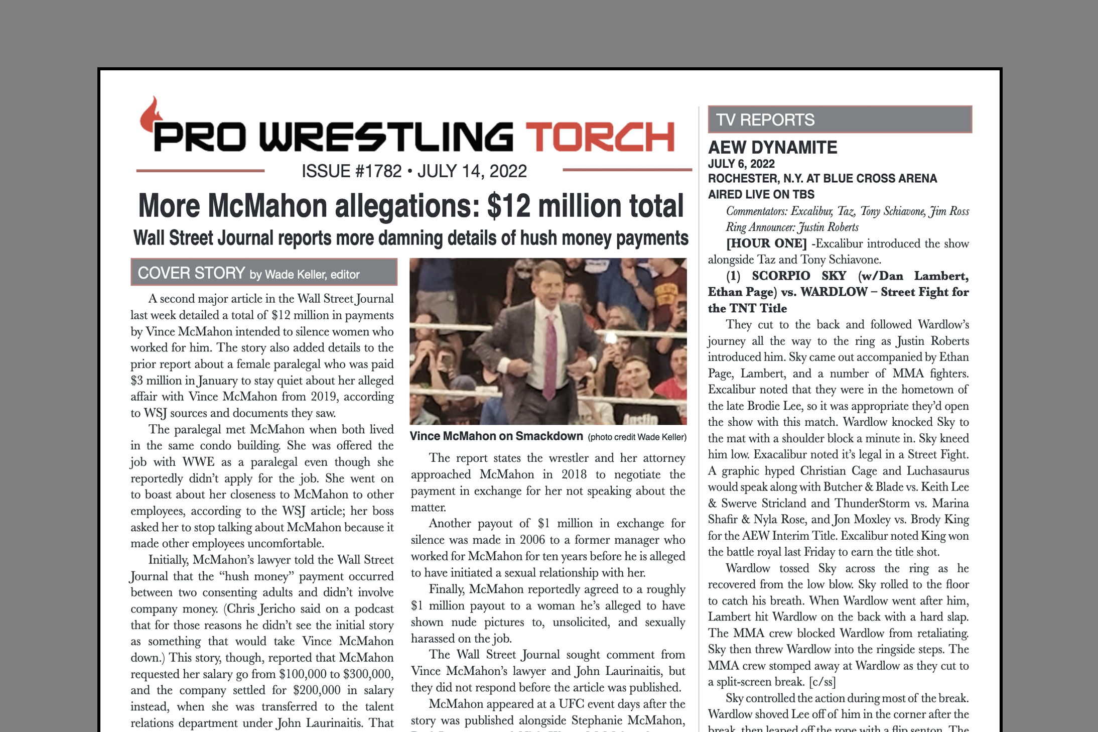 SUMMARY: This week’s PWTorch Newsletter features Wade Keller’s cover story on new Vince McMahon allegations in second major Wall Street Journal article. Alan Counihan column asks whether Japanese wrestling has lost its voice… Greg Parks column assessing what happened in pro wrestling while on vacation… Keller TV reports… Torch Newswire… And more…