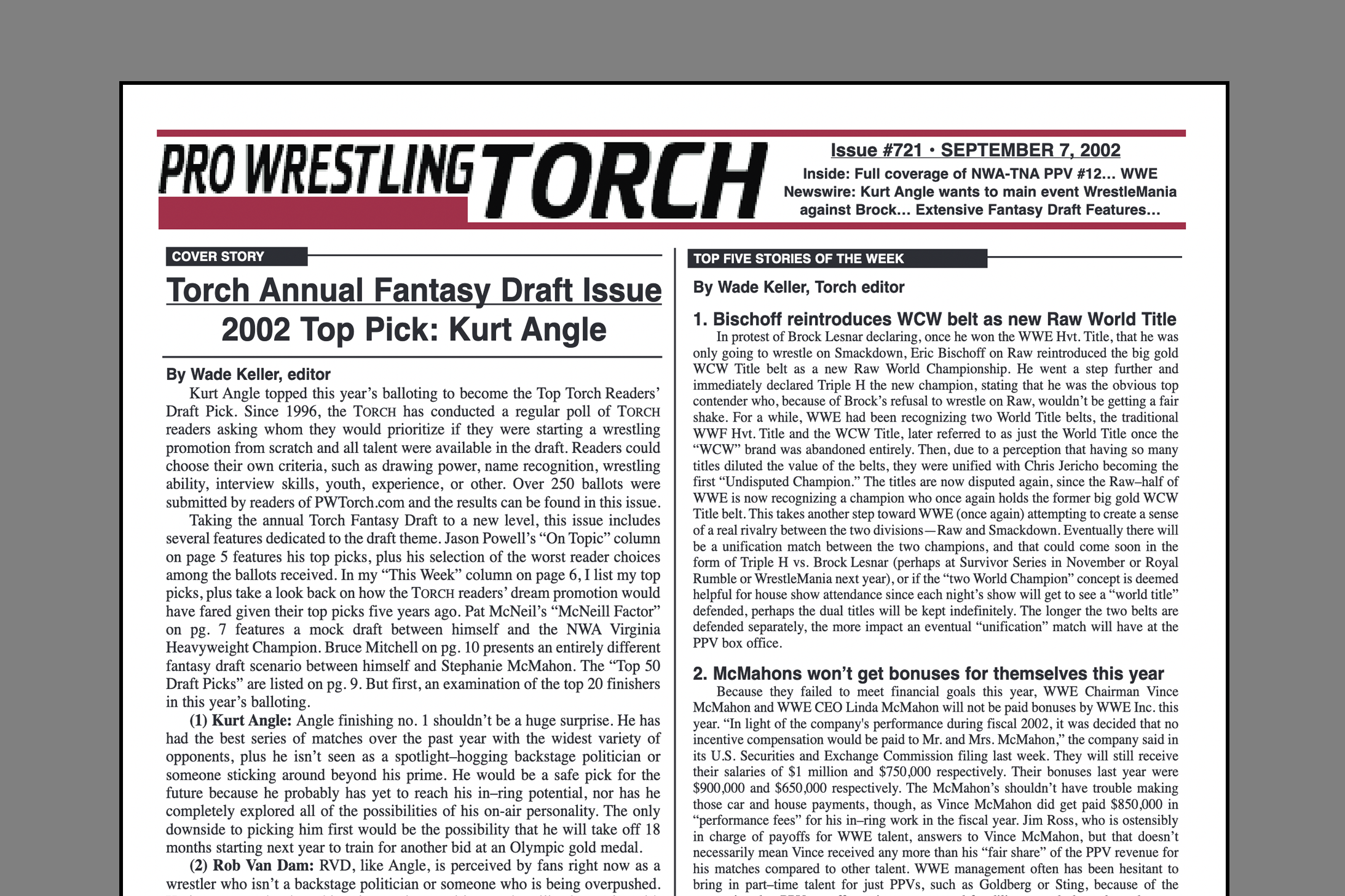 SUMMARY of #721 cover-dated September 7, 2002: This issue feature the 2002 Torch Draft featuring the Top 50 Reader Votes, Keller’s analysis, and feature draft-themed columns from Pat McNeill, Jason Powell, and Bruce Mitchell… Plus WWF Newswire, TNA Newswire, ETC. Newswire, TV reports, TNA PPV Report with Roundtable Reviews, 1992 Backtrack, and more…
