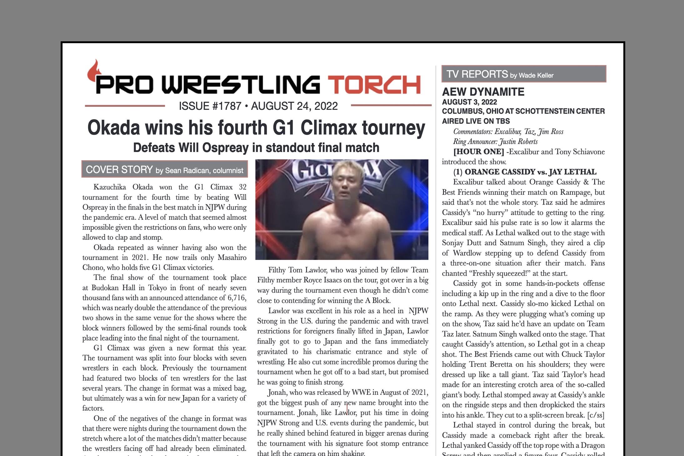 SUMMARY: This week’s PWTorch Newsletter features Sean Radican’s cover story on Okada’s G1 Tournament win… Greg Parks on Paul Levesque bringing back NXT favorites… Keller’s reports on Dynamite, Raw, Smackdown… Torch Newswire… More…
