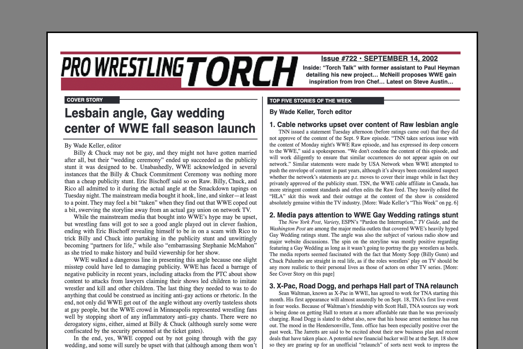 VIP 2002 BACK ISSUE – Pro Wrestling Torch #722 (September 14, 2002): Lesbian Angle and Gay Wedding at Center of new WWE season, Torch Talk with Gabe Sapolsky, McNeill proposes how to revamp Raw