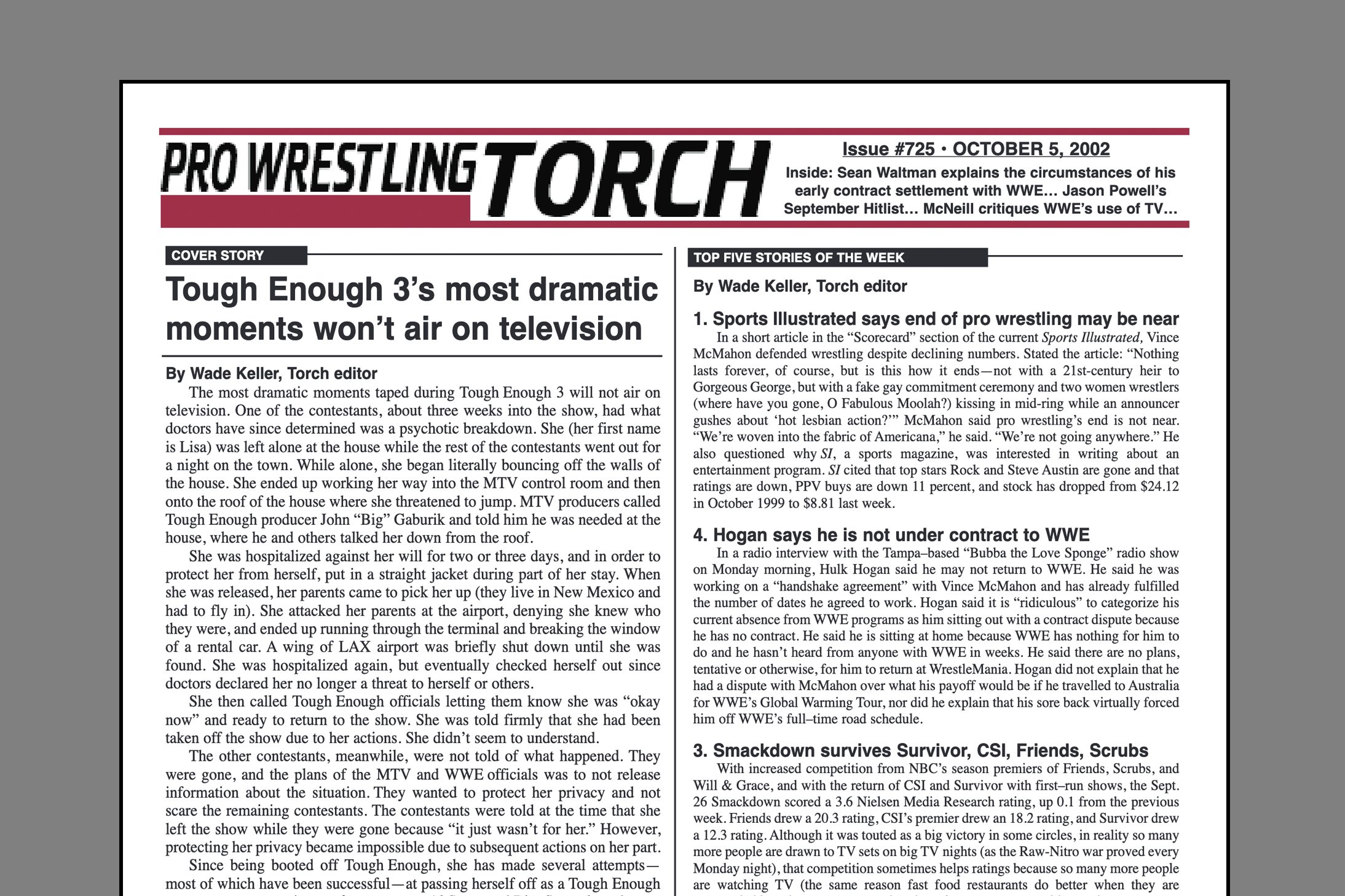 SUMMARY of #725 cover-dated October 5, 2002: This issue opens with a cover story that goes behind the scenes with exclusive details on scandals on the pre-taped Tough Enough season… The beginning of a major “Torch Talk” series with Sean “X-Pac” Waltman going behind the scenes on some of the biggest moments of the Monday Night War Era… TNA PPV Report and Roundtable Reviews… Wade Keller’s “This Week” column compares the Bret Hart Swerve to the Steve Austin Walk-out and resulting controversies… Jason Powell’s September Hitlist… Plus WWE Newswire, TNA Newswire, ETC. Newswire, TV Reports, 1992 Backtrack, The Top Five Stories of the Week, and more…