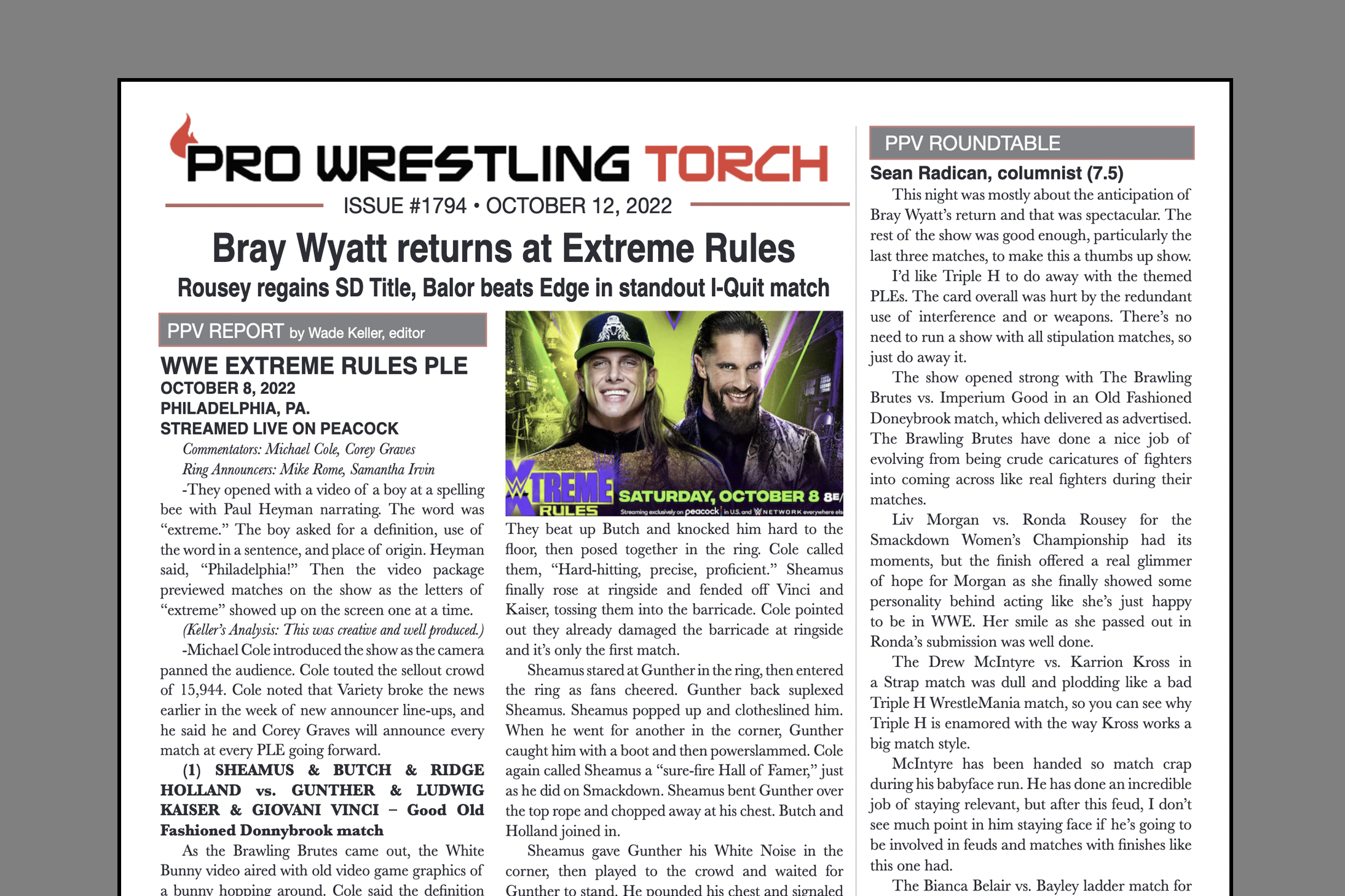 SUMMARY: This week’s PWTorch Newsletter features Wade Keller’s Keller’s WWE Extreme Rules report & Staff Roundtable Reviews… Greg Parks feature column on WWE announcing shake-up… Torch Newswire… Keller’s TV reports on Dynamite and Smackdown…