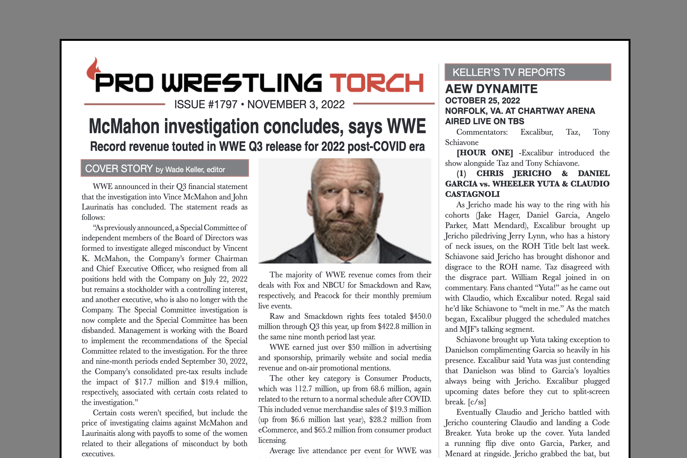 VIP NEWSLETTER – PRO WRESTLING TORCH #1797 (Nov. 3, 2022): Keller’s cover story on WWE Q3 financials and McMahon investigation ending, Parks and Fann columns, Newswire, more