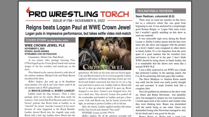 SUMMARY: This week’s PWTorch Newsletter features Wade Keller’s WWE Crown Jewel Report and Crown Jewel Staff Roundtable Reviews & Scores… Special Feature: Kelly Wells’ thorough NXT Roster Evaluation with tiers and analysis… Keller’s TV reports on Smackdown, Raw, and Rampage… Torch Newswire…
