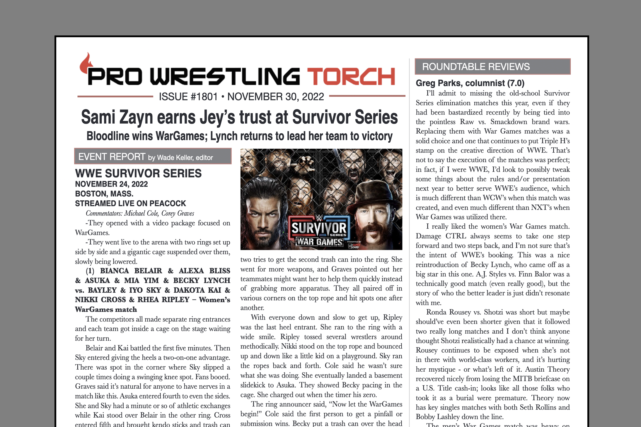 SUMMARY: This week’s PWTorch Newsletter features Wade Keller’s WWE Survivor Series PPV report… WWE Survivor Series Staff Roundtable Reviews with scores… Greg Parks’ feature column on the trajectory of current WWE champions and who will still be champion at WrestleMania.. Keller’s TV reports on Dynamite, Rampage, Smackdown, and Raw… And more…