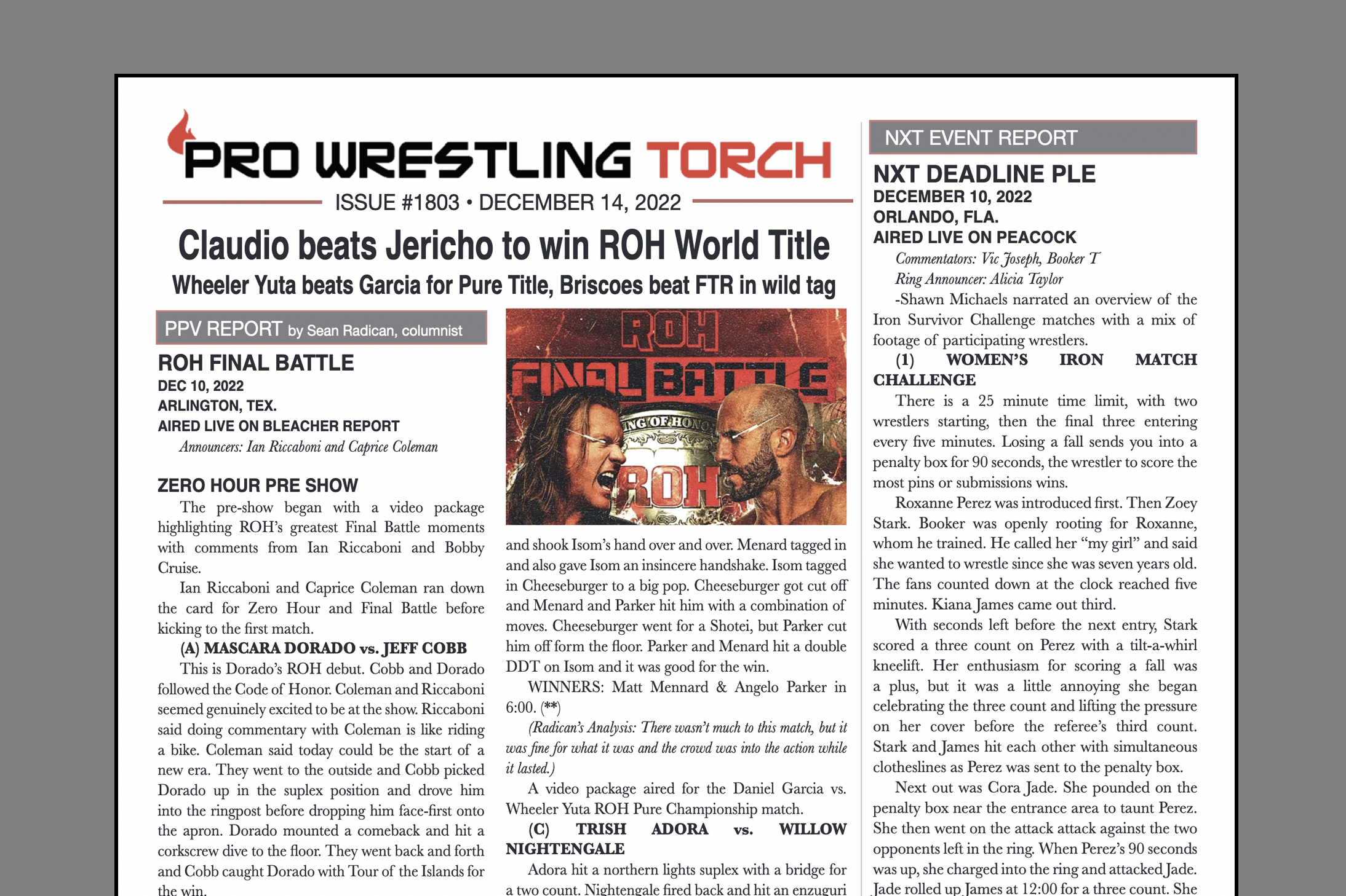 SUMMARY: This week’s PWTorch Newsletter features Sean Radican’s ROH Final Battle PPV report with star ratings and analysis… Greg Parks’s feature column examining the history of WWE special matches compared to NXT’s new Iron Match Challenge… Keller’s newsletter-exclusive NXT Deadline PLE report… Keller’s TV reports on Raw, Smackdown, and Dynamite… Torch Newswire… More…