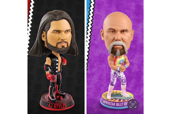 The A.J. Styles Bighead features him in an action pose wearing his signature outfit and standing on top of a thematic base. The Superstar Billy Graham Bighead also features him in an action pose wearing his signature outfit and standing on top of a thematic base. Both Bigheads are limited to 144 units, retail for $55, and stand at nearly 10 inches tall.
