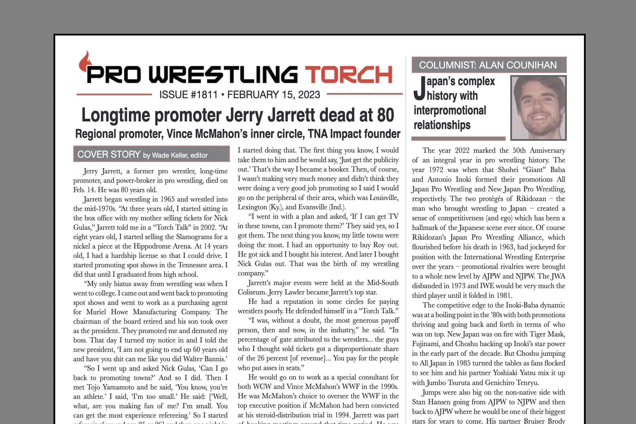 SUMMARY: This week’s PWTorch Newsletter features Wade Keller’s cover story on Jerry Jarrett… Alan Counihan column on Japan’s interpromotional history… Greg Parks on WWE injuries in 2023… Keller’s TV reports on Raw, Dynamite, and Smackdown… Sean Radican’s NJPW PPV report… Torch Newswire… More…