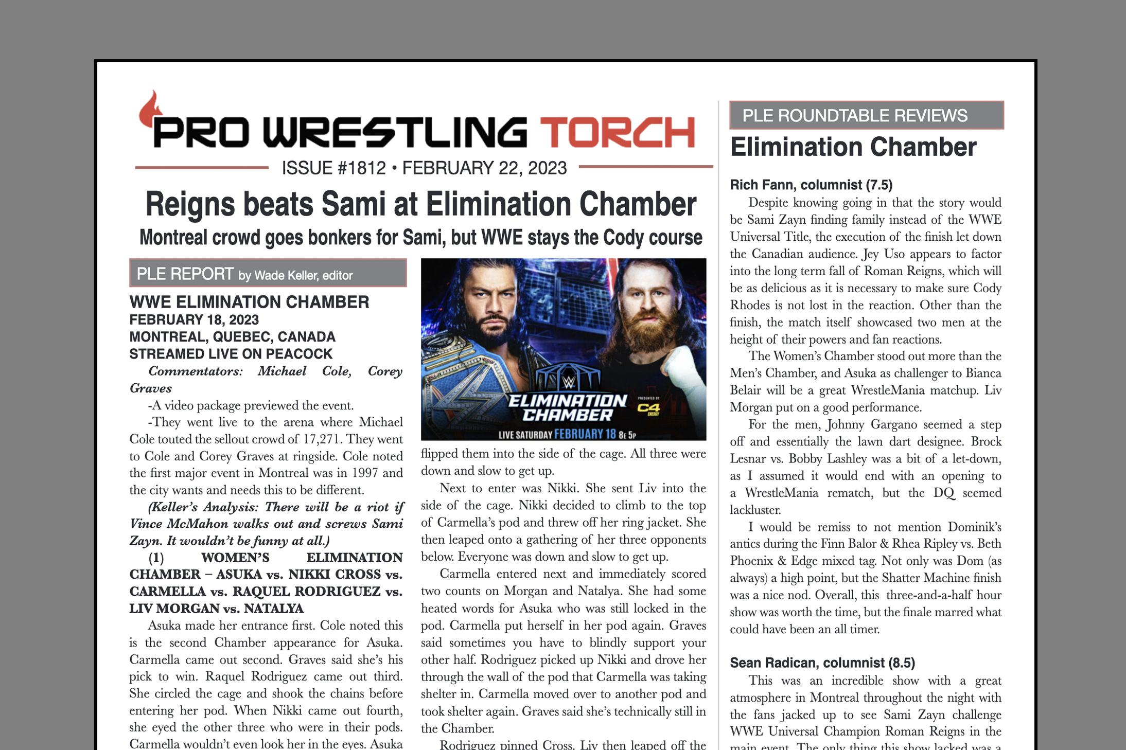SUMMARY: This week’s PWTorch Newsletter features Wade Keller’s report on the WWE Elimination Chamber PLE event… Roundtable Reviews of Elimination Chamber… Greg Parks on Eric Bischoff’s new book… Keller’s TV reports on Raw, Dynamite, and Smackdown… Torch Newswire… More…