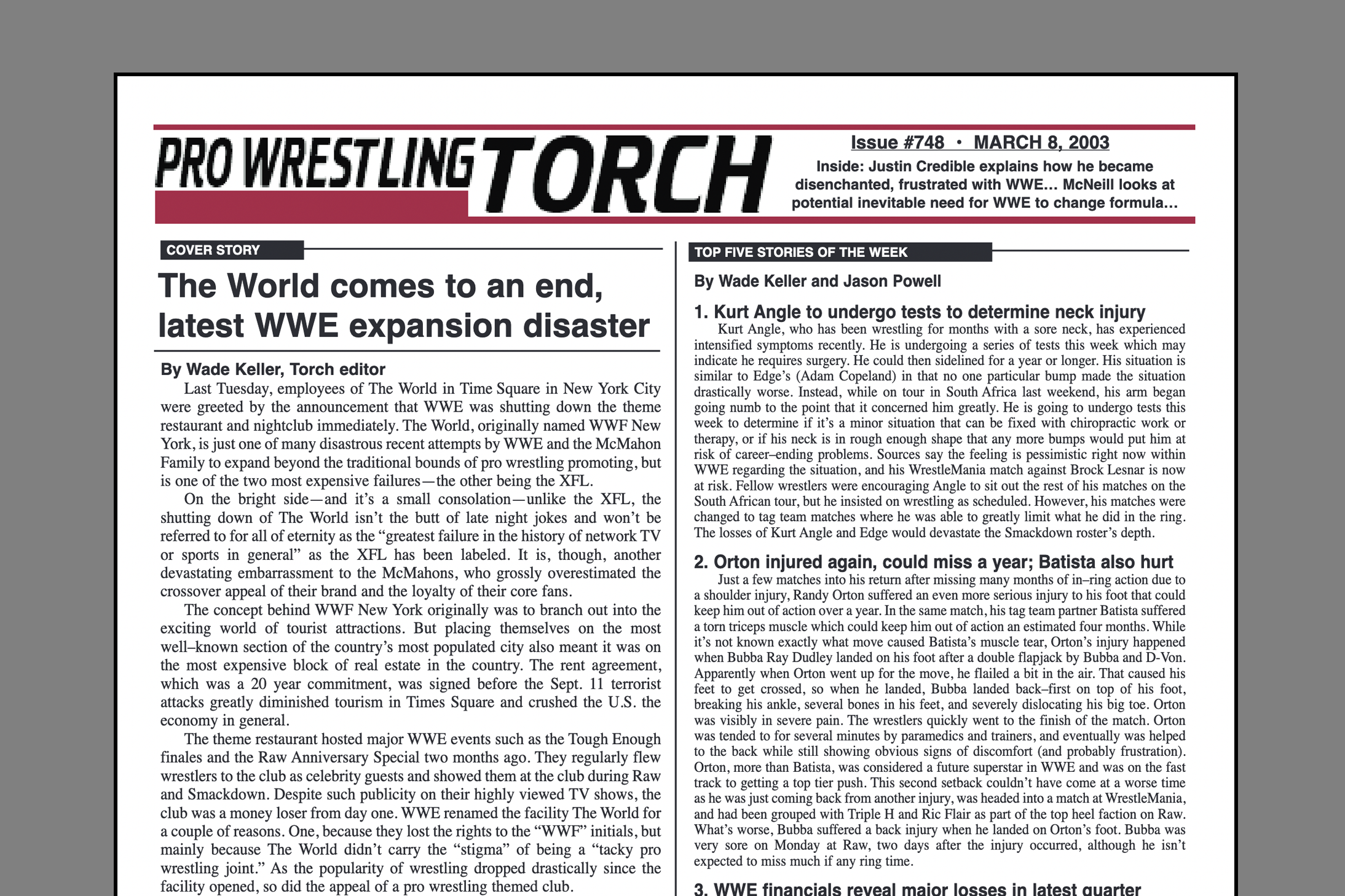 SUMMARY of #748 cover-dated March 8, 2003: This issue features a cover story on the WWE World nightlclub in New York City coming to an end… Keller’s “This Week” feature column on WWE brand split surviving without key names… Pat McNeill’s feature column focuses on how Steve Austin or The Rock may delay inevitable need for change… Jason Powell’s “On Topic” features the February Hitlist… Torch Talk with Justin Credible talking about being completely miserable in the wrestling business… Keller’s TNA PPV report with staff roundtable reviews… Plus Torch Newswire and summaries of Raw and Smackdown…