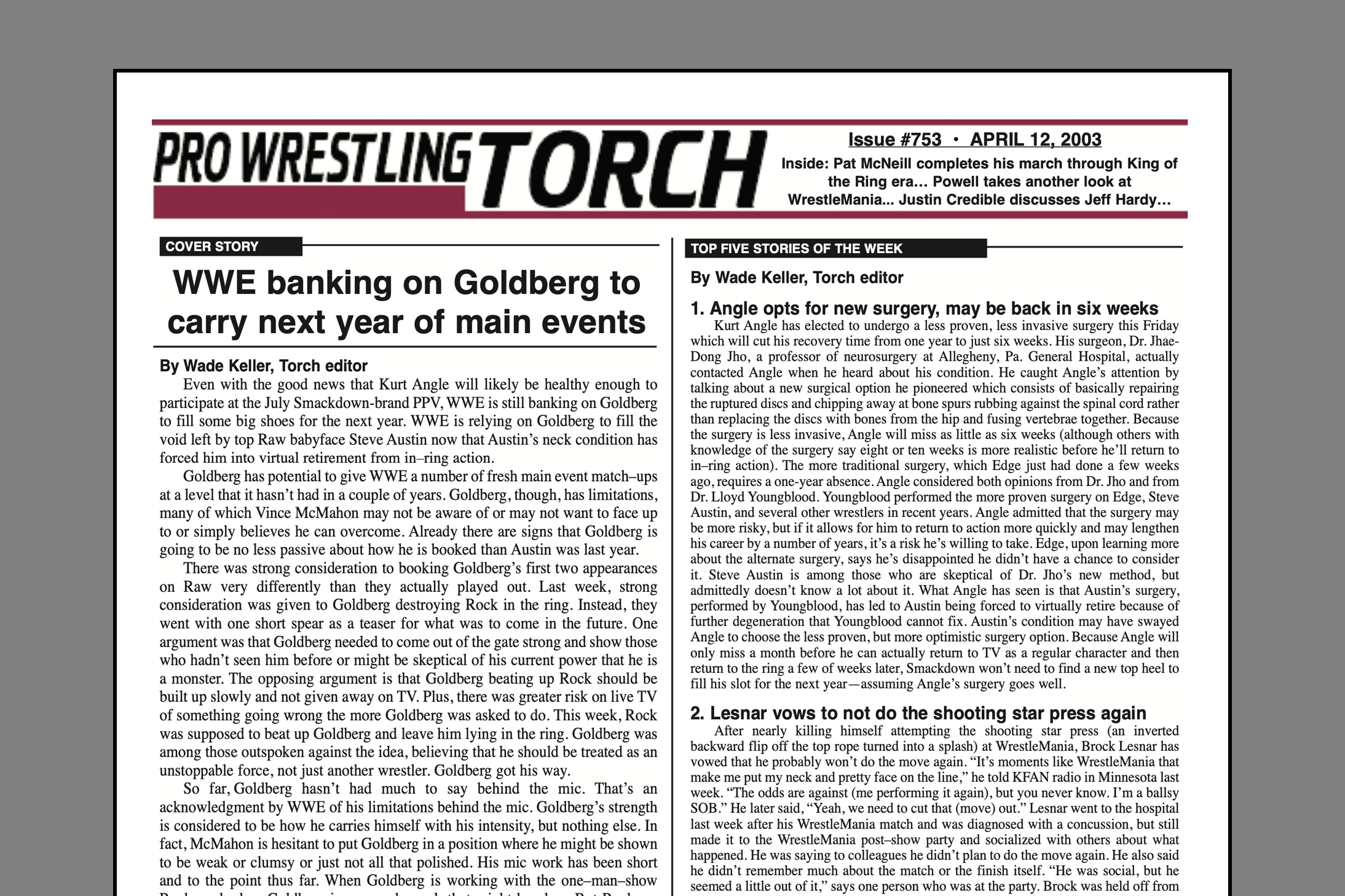 SUMMARY of #753 cover-dated April 12, 2003: This issue features a cover story on WWE banking on Goldberg to carry next year of main events… Jason Powell says on second thought, WrestleMania 19 wasn’t so good… Pat McNeill’s third installment of the history of the King of the Ring… Torch Talk part six with Justin Credible on why he has trouble accepting the Tough Enough students… Keller’s TNA PPV report with staff roundtable reviews… Plus Torch Newswire, summaries of Raw and Smackdown, Key Live Event results, and the Top Five Stories of the Week…