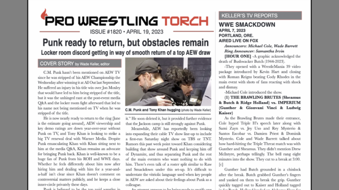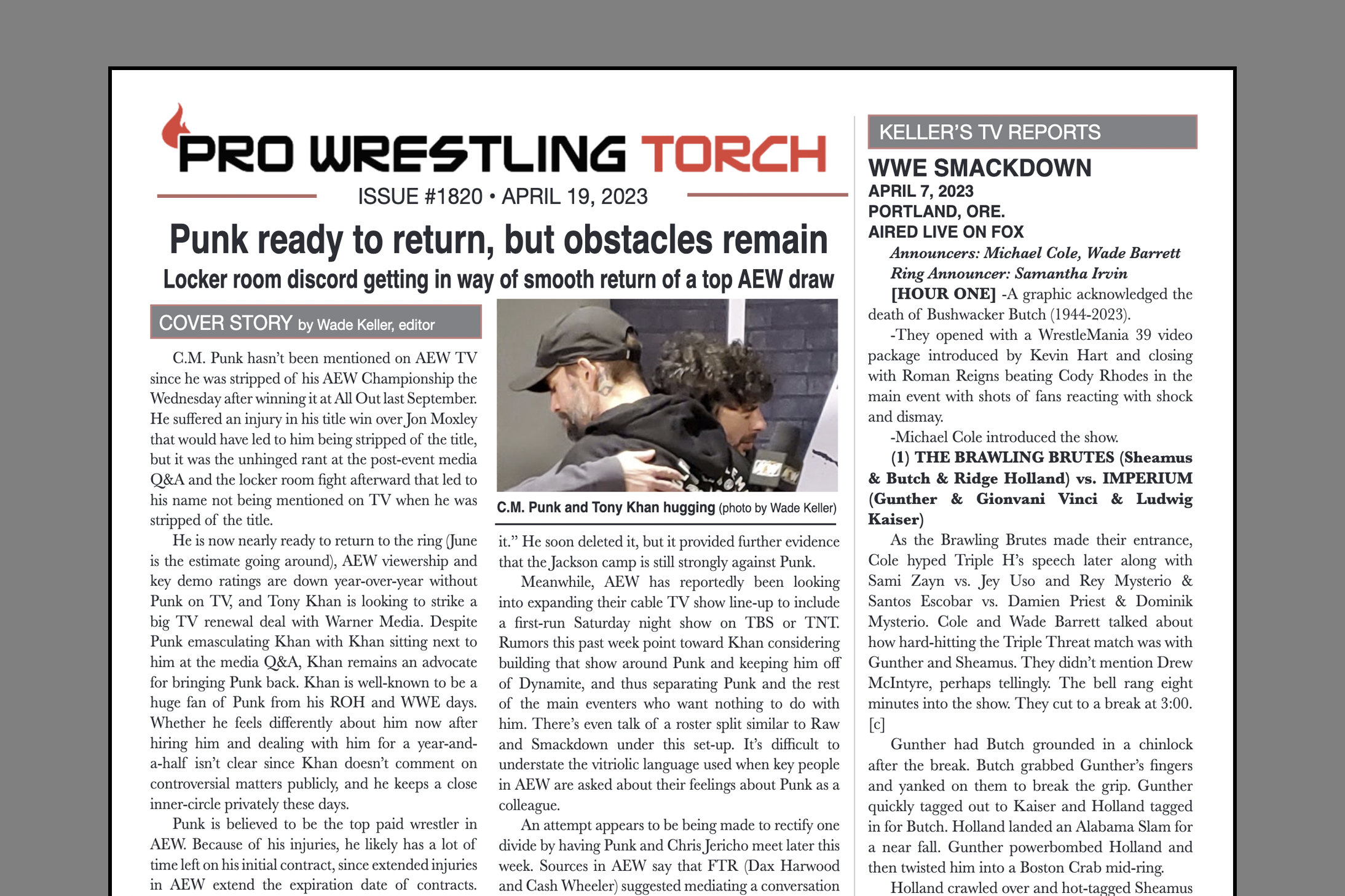 VIP NEWSLETTER – PRO WRESTLING TORCH #1820 (April 19, 2023): Keller’s cover story on Punk’s potential AEW return, Parks looks at WWE PLE main event options, Keller’s TV reports, Impact PPV report