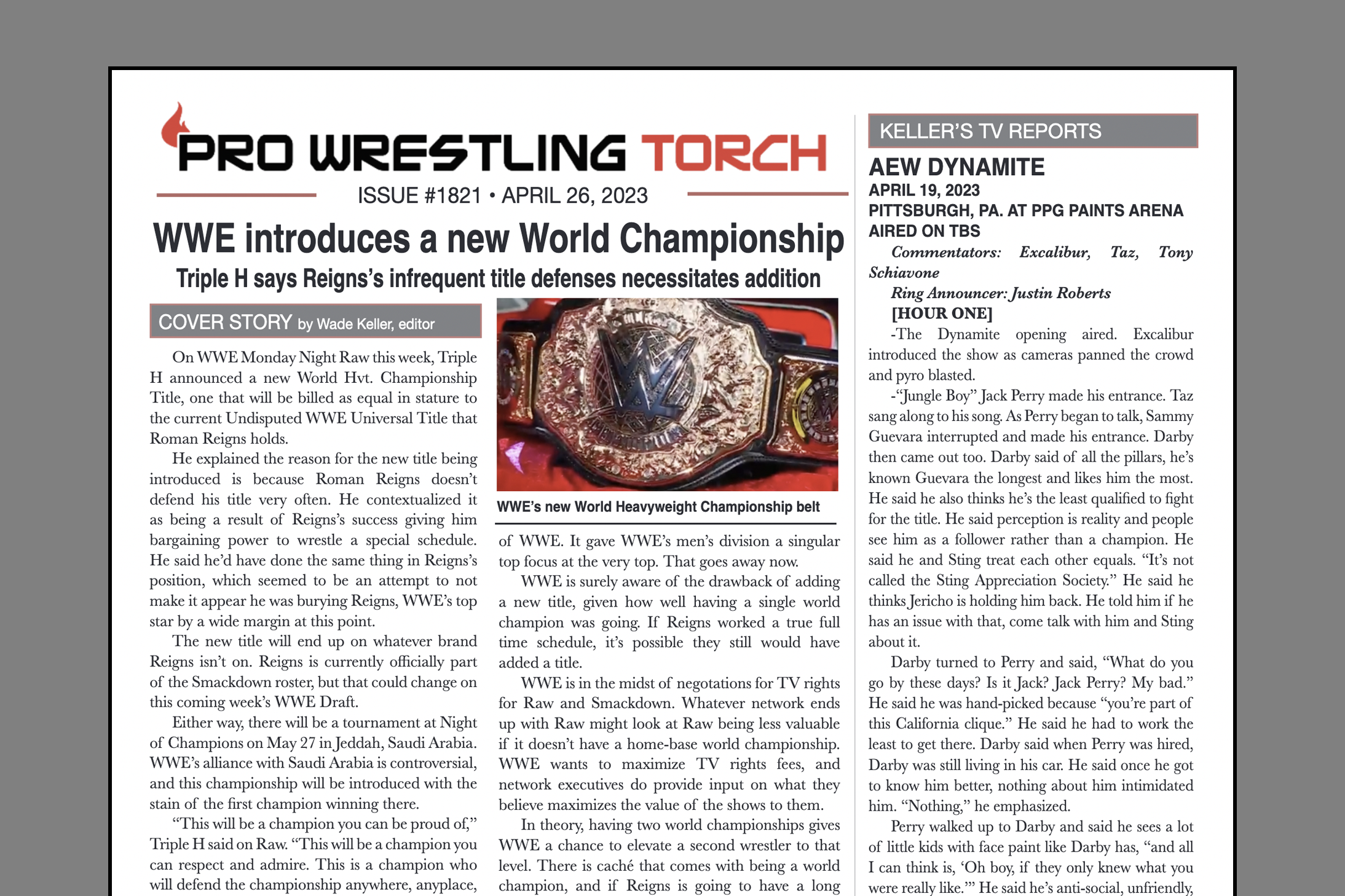 SUMMARY: This week’s PWTorch Newsletter features Wade Keller’s cover story on the introduction of new WWE World Hvt. Title belt… Sean Radican’s column on AEW botching Jay White’s introduction… Greg Parks’s column reviewing Madusa (Alundra Blayze’s) autobiography… Torch Newswire including details on C.M. Punk’s visit to Raw and the potential ramifications… Keller’s TV reports on WWE Raw, WWE Smackdown, AEW Dynamite, and AEW Rampage… And more…