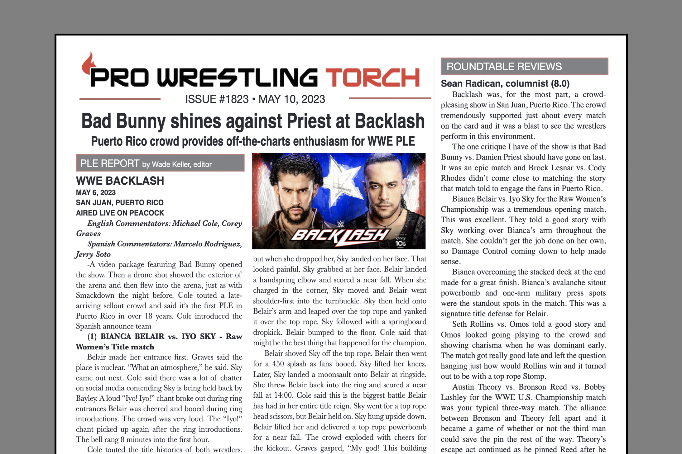 SUMMARY: This week’s PWTorch Newsletter features Wade Keller’s WWE Backlash PLE Report & Staff Roundtable Reviews… Greg Parks feature column reviews Draft Night 2… Keller’s TV reports… More…