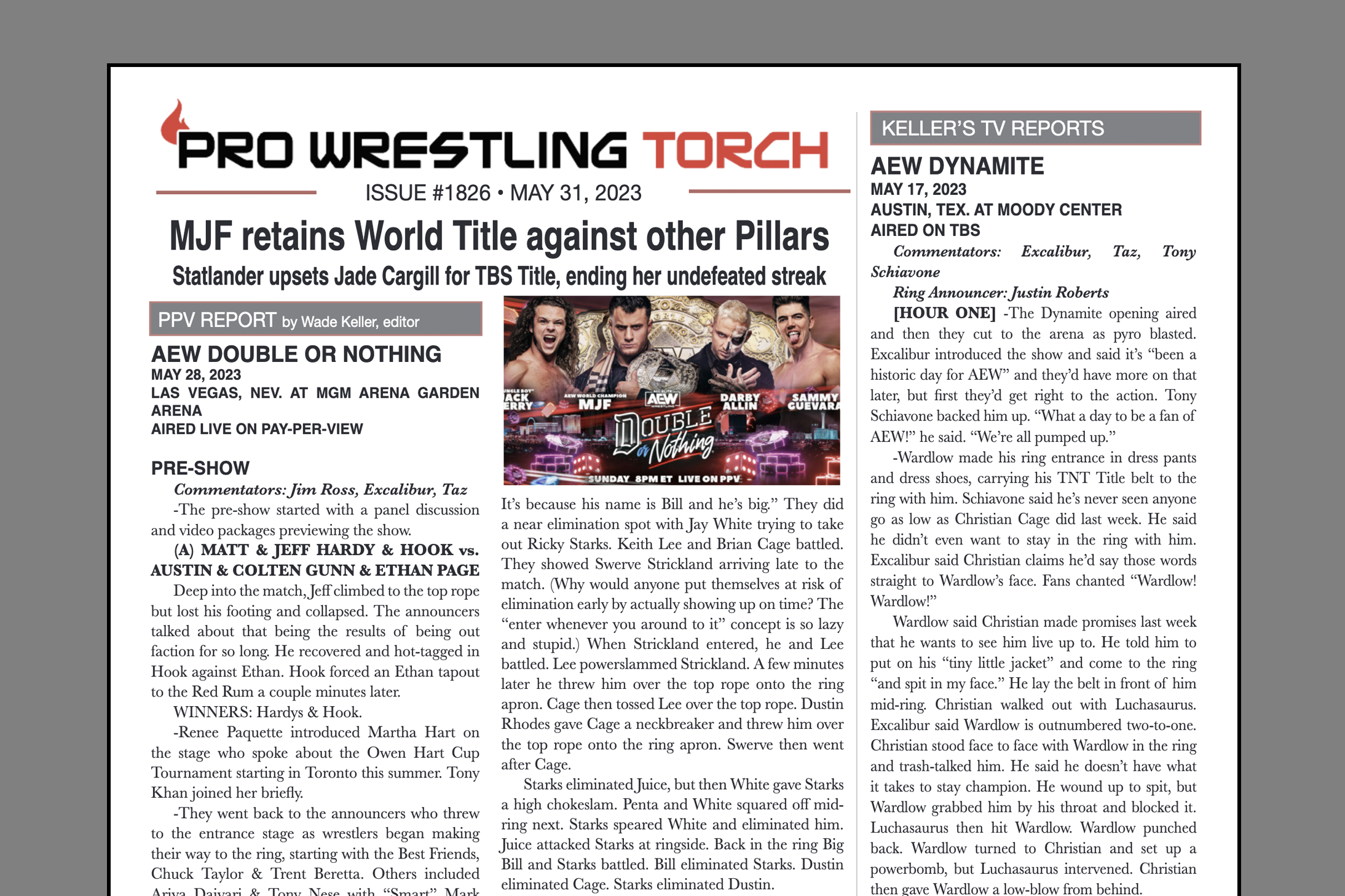 SUMMARY: This week’s PWTorch Newsletter features Wade Keller’s AEW Double or Nothing report… Rich Fann’s AEW PPV review… Keller’s Dynamite TV reports… Kelly Wells’s NXT Battleground report… More…