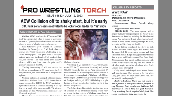 SUMMARY: This week’s PWTorch Newsletter features Wade Keller’s Cover Story on AEW Collision’s first four weeks… Greg Parks’s feature column on what he most likes about pro wrestling these days… Keller’s TV Reports on Smackdown, Dynamite, and Collision… Torch Newswire… And more…