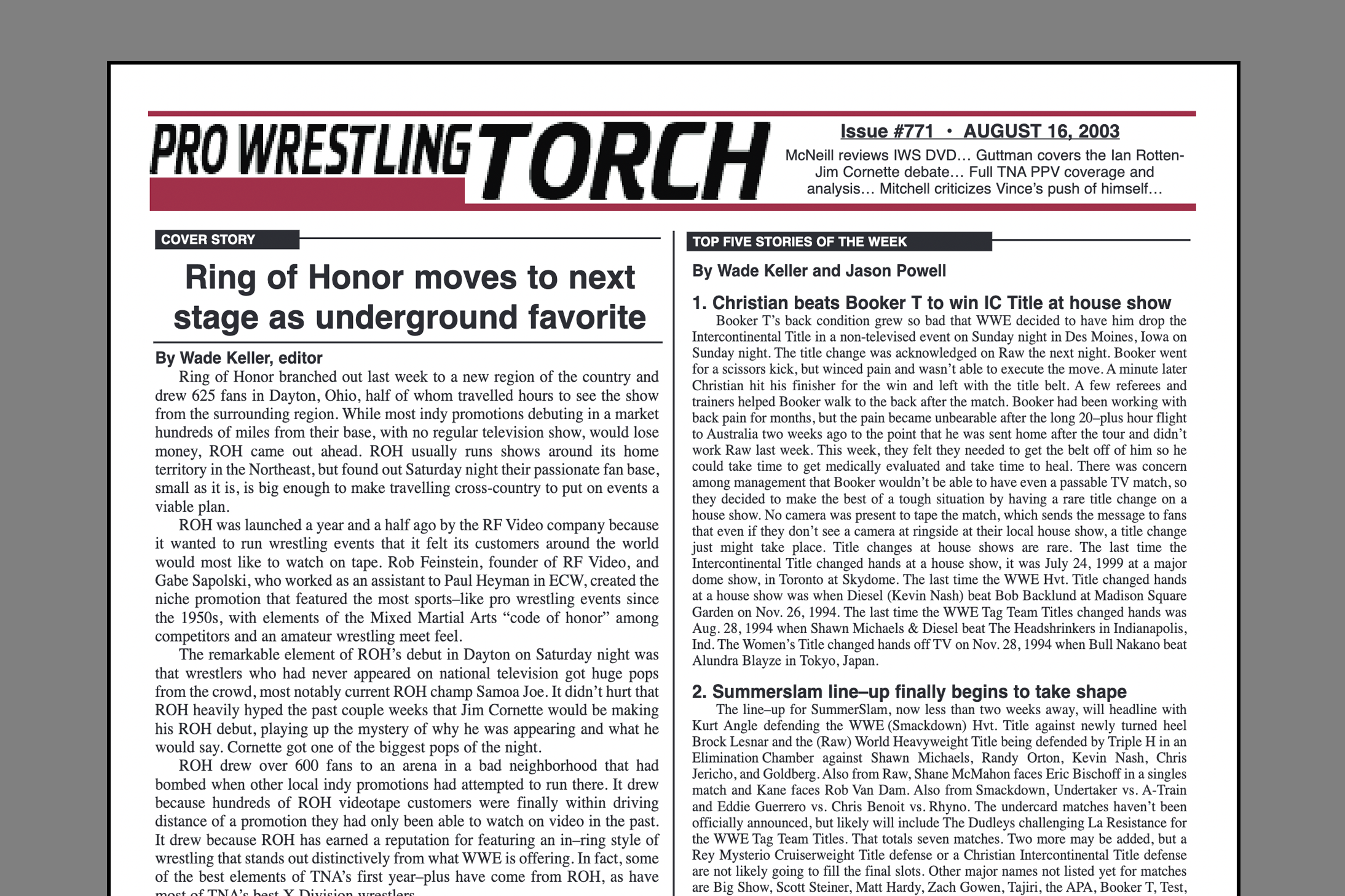 SUMMARY of #771 cover-dated August 16, 2003: This issue begins with a cover story on Ring of Honor moving to a new stage as an underground favorite… On Topic with Jason Powell: Did WWE turn Brock too soon? And review of the XWF PPV… McNeill Factor: Review of the IWS DVD “Know Your Enemies”… James Guttman: Ian Rotten’s view of pro wrestling as an artform… Mitchell’s Memo on the Angle, Lesnar, McMahon relationship… The fifth and final installment of the Torch Talk with Konnan including fans disrespectful chants… Keller’s TNA PPV report with Roundtable Reviews…