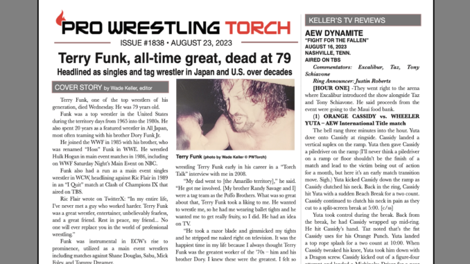 SUMMARY: This week’s PWTorch Newsletter features Wade Keller’s cover story on Terry Funk… Greg Parks’s feature column on L.A. Knight’s future… Alan Counihan column on Tetsuya Naito’s journey (part 1 of 2)… Keller’s TV reports on Raw, Smackdown, Collision, and Dynamite… Torch Newswire… More…