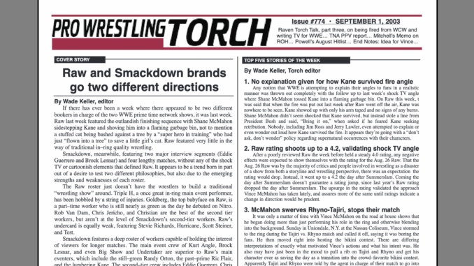 SUMMARY of #774 cover-dated September 6, 2003: This issue begins with a cover story on Raw and Smackdown going in two different directions… This Week with Wade Keller: Kurt Angle – Creative License or Crappy Storytelling… McNeill Factor: Drawing Power Outage… or Win, Lose, No Draw… Mitchell’s Memo on Ring of Honor… On Topic with Jason Powell: August Hitlist… Torch Talk with Raven, part three, on how sometimes it’s his fault that he’s hated… Plus Torch Newswire, Keller’s TNA PPV Report, Torch Backtracks, TV Reviews, Top Five Stories of the Week, and more…