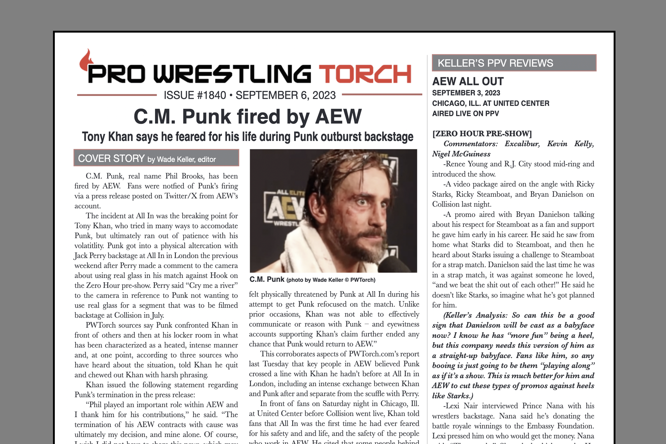 SUMMARY: This week’s PWTorch Newsletter features Wade Keller’s Cover Story on AEW firing Punk… Keller’s reports on WWE Payback and AEW All Out with star ratings… Roundtable Reviews of Payback… Greg Parks feature column on Punk… Keller’s TV reports on Smackdown and Dynamite… More…
