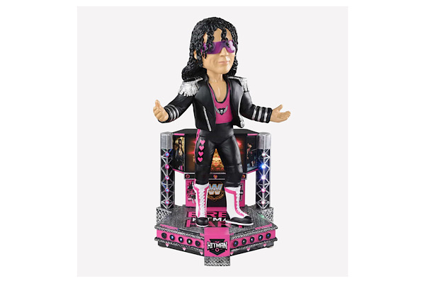 The Bret Hart bobblehead features him in an action pose wearing his signature outfit and sunglasses atop a stage themed base. For the first time ever with a WWE FOCO bobblehead, the stage lights up along the sides and on the bottom. Hart’s logo and nickname, “The Hitman,” can be found in multiple places on the base as well. The Hart bobblehead is limited to 223 units, stands at 7 inches tall, and retails for $90.