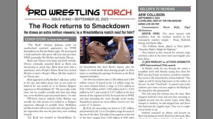 SUMMARY: This week’s PWTorch Newsletter features Wade Keller’s Cover Story on the return of Rock to Smackdown, viewership impact, potential WrestleMania match… Keller’s TV reports on Raw, Smackdown, Dynamite, Collision… Greg Parks feature column on the new Netflix series “Wrestlers”… Torch Newswire… More…