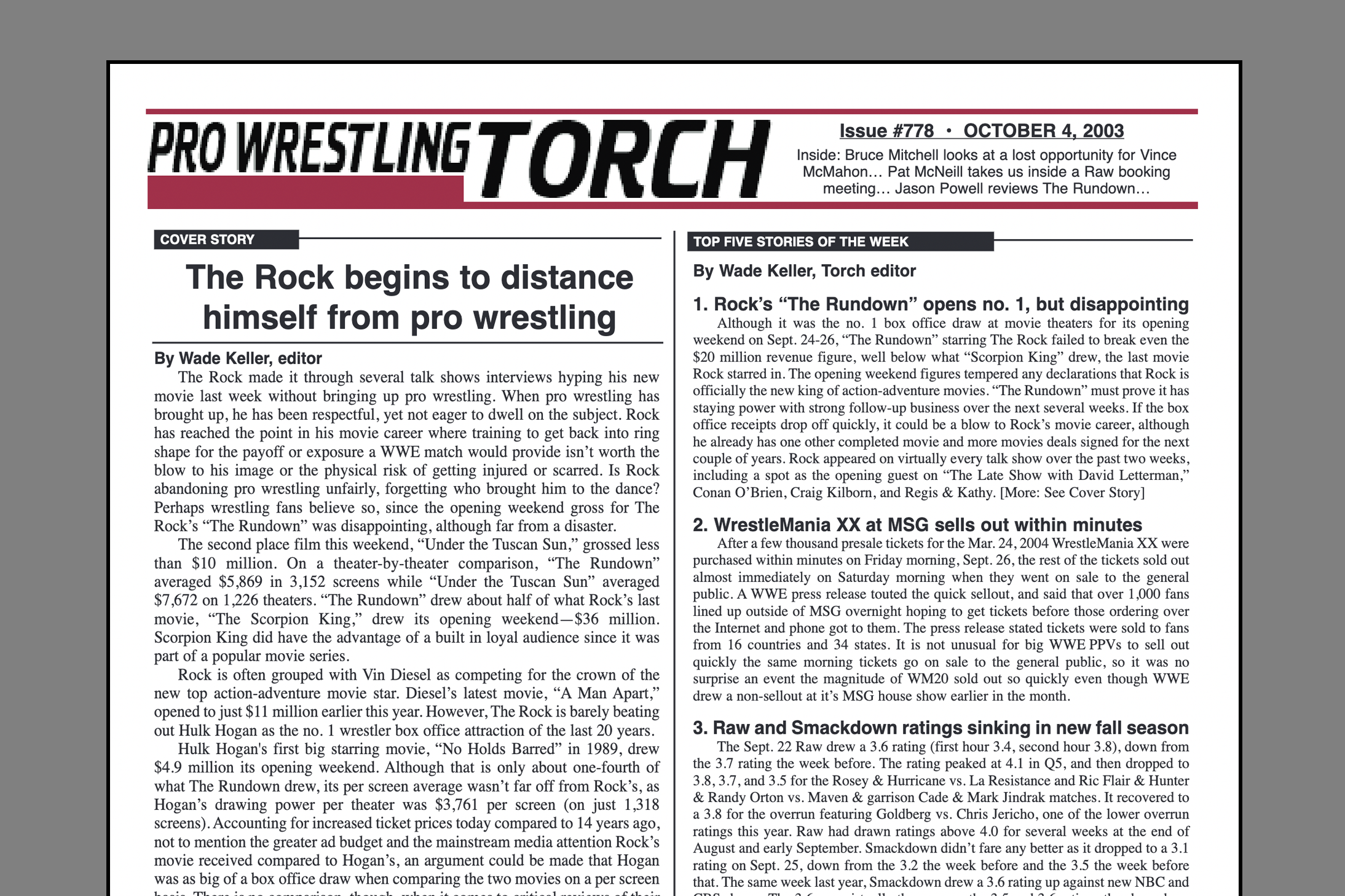 SUMMARY of #778 cover-dated October 4, 2003: This issue begins with a cover story titled: The Rock begins to distance himself from pro wrestling… The Top Five Stories of the Week begins with the box office returns for “The Rundown”… WWE Newswire features Triple H saying he will be more loyal to pro wrestling than The Rock… On Topic with Jason Powell: September Hitlist… This Week with Wade Keller: WrestleMania 20 Dream Card – All Wrestlers in Their Primes… McNeill Factor: Inside the Raw Production Meeting… Torch Talk with Raven, pt. 5: “I was espousing all of Jeff Jarrett’s points in the Russo camp”… Bruce Mitchell feature column: Consumer Advisory – Why McMahon isn’t giving the fans what they’re paying for… Plus Torch Newswire, the Top Five Stories, TV reports, Live Event Results, 1993 Backtrack, End Notes with Wade Keller, and more…
