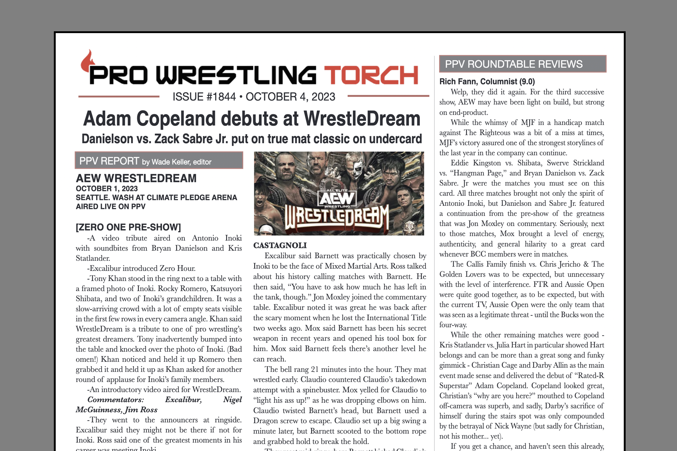 SUMMARY: This week’s PWTorch Newsletter features Wade Keller’s AEW WrestleDream PPV report with star ratings… Torch Newswire… Greg Parks column evaluates WWE roster cuts, pt. 2… Keller TV reports… And more…