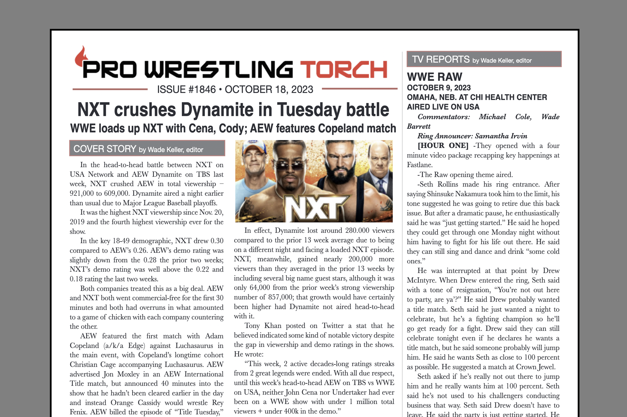 SUMMARY: This week’s PWTorch Newsletter features Wade Keller’s Cover Story on the NXT vs. AEW Tuesday battle… Greg Parks column on AEW-NXT… Keller’s TV Reports… Torch Newswire…