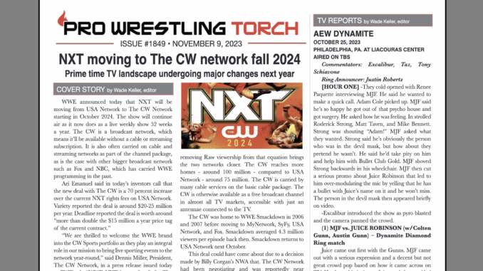 VIP NEWSLETTER – PRO WRESTLING TORCH #1849 (Nov. 9, 2023): Keller’s Cover Story on NXT heading to The CW, New Japan Power Struggle Report, Keller’s AEW TV Report, Newswire