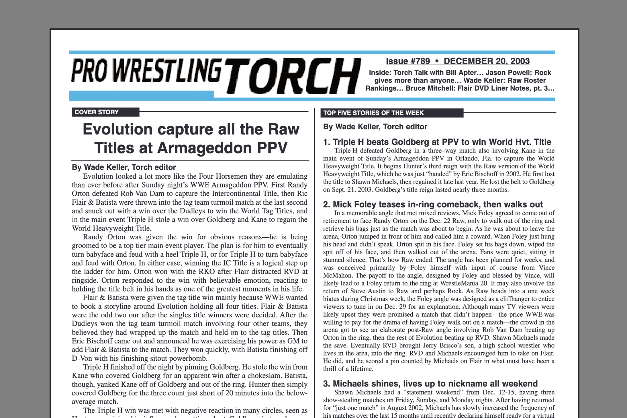 SUMMARY of #789 cover-dated December 20, 2003: This issue includes Keller’s WWE Roster Evaluation… Torch Talk with Bill Apter part two… Evolution’s big PPV night with a title sweep… Powell on Rock-Cena prospects… Mitchell on Flair DVD… and more…