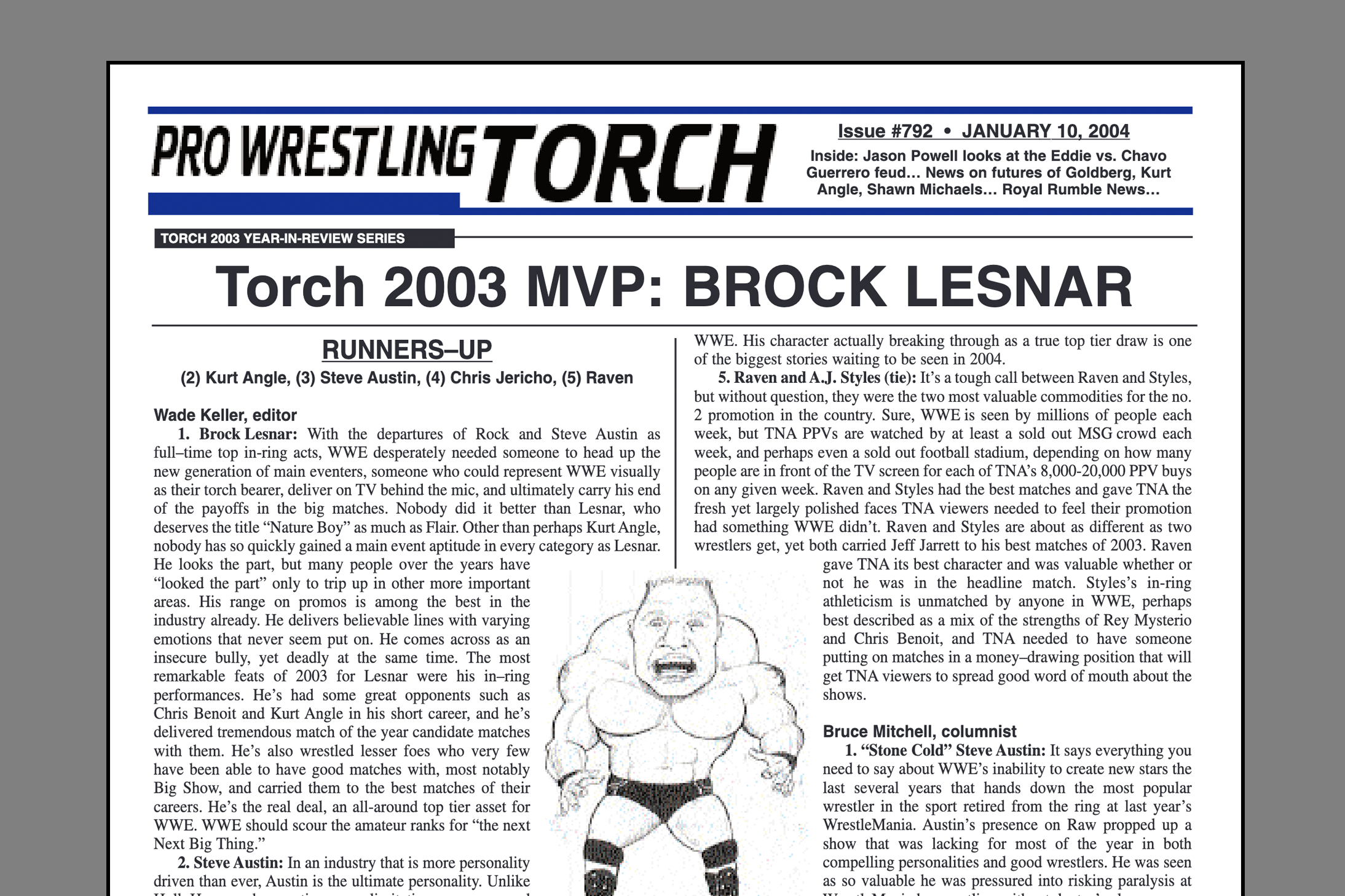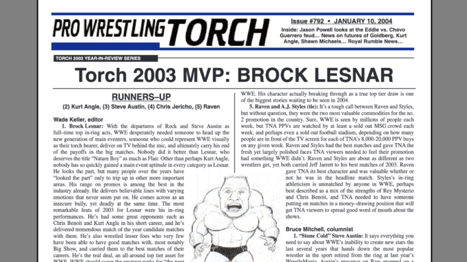 SUMMARY of #792 cover-dated January 10, 2004: This issue features the 2003 Torch Awards including MVP of the Year, Best Wrestler, Best Heel, Best Babyface, Best PPV, Best Feud, and Best TV Series. Also, the WWE Newswire features several first-generation insider scoops on behind the scenes happenings in WWE related to this week’s Raw, the Royal Rumble, WrestleMania, Goldberg’s future, Kevin Nash’s future, Kurt Angle’s future, roster cutbacks, and more. Jason Powell’s full-page “On Topic” column takes an in-depth look at the Guerreros feud and how with a little depth and a turn away from the ordinary and obvious it could really take off. Plus, Wade Keller’s “End Notes” featuring his random thoughts on the bigger stories of the week, brief TV Summaries and Match Results from the major shows of the past week, the handy “Upcoming Events” schedule, and more!