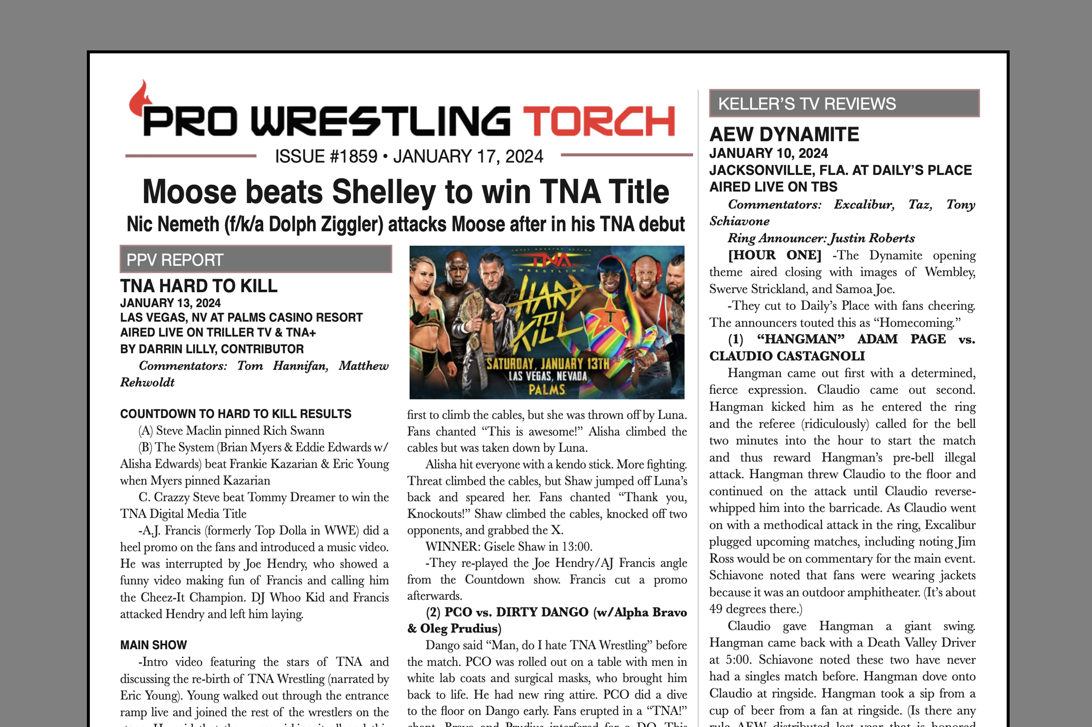 SUMMARY: This week’s PWTorch Newsletter features Darrin Lilly’s TNA Hard To Kill PPV report… Greg Parks’s 2023 Parksy Awards… Keller’s TV reports… Newswire… more