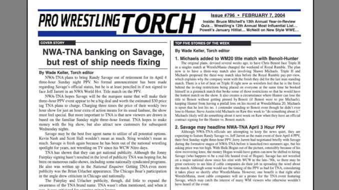 SUMMARY of #796 cover-dated February 7, 2004: This week’s Torch Newsletter also features the 12th annual article listing and detailing “Wrestling’s 15 Most Influential People” and a complete list of past rankings dating back to 1992. Find out who really wields power behind the scenes, and how that has changed from year to year for the past 12 years… The TNA Newswire… Wrestling’s 12 Annual Most Influential List with a listing of the 15 most influential people in wrestling in 2003, plus all past lists so you can see how the power structure has shifted year-to-year… Pat McNeill’s “McNeill Factor” looking at the New Style WWE workrate… Wade Keller’s End Notes featuring his reaction to Paul Heyman’s speech on Smackdown last week regarding how Vince McMahon’s handling of past defections inspired him… The Top 5 Stories of the Week: Details on the changing of WrestleMania’s Raw main event, Randy Savage headlining TNA’s April PPV, Brian Urlacher, and more… WWE Newswire packed with the very latest news including: The WrestleMania line-up is almost completely set. This week’s Torch Newsletter “WWE Newswire” features a list of all of the official matches so far, what possible variations there are on the undercard, which matches will be promoted the most, and why one wrestler who has moved down the card isn’t particularly upset about it. We also have the listing of the No Way Out card so far, and the inside scoop on something planned for tonight’s Smackdown taping that will influence one No Way Out title match. Plus, more details than you’ll read anywhere regarding the status of Hulk Hogan and The Rock as it pertains to WrestleMania and beyond. Plus, is ECW going to replace Confidential on Saturday nights? There are some indications that suggest it might be in the plans down the line. We tell you the details. Plus, the WWE Newswire features the latest injury report… Notes on this week’s Raw Japan tour… Why Kane vs. Goldberg was featured on Raw last night… Which wrestler threw a Superbowl party for his fellow wrestlers on Sunday… What internet headline about a returning WWE talent was wrong… The story behind Shawn Michaels being added to the Chris Benoit vs. Triple H match – when the change was made and the reasons why… Plus: The Top Five Stories of the Week… Jason Powell’s On Topic featuring his January Hitlist… Torch Talk, part four, with Bill Apter…